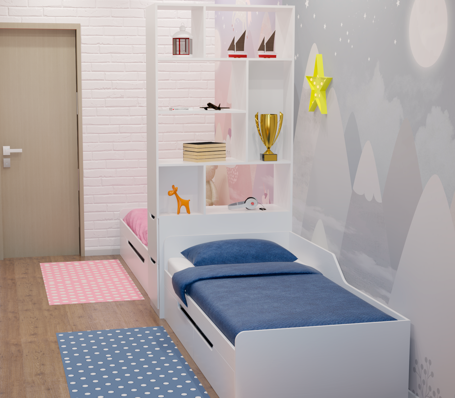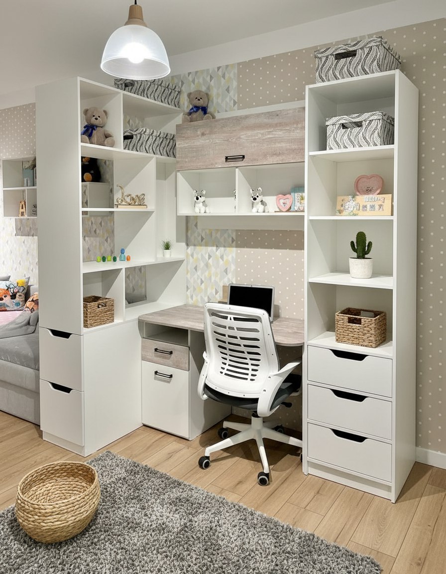С помощью стеллажа можно разделить комнату на отдельные зоны: отдыха, учебы, встречи с друзьями, можно зонировать комнату для двоих детей.