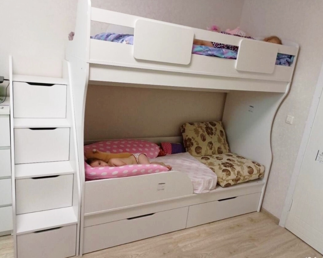 Двухъярусная кроватка - это настоящая детская мечта. Станет личным пространством и местом для волшебных снов ваших деток. Белый цвет визуально расширяет пространство и отлично подходит разнополым детям.