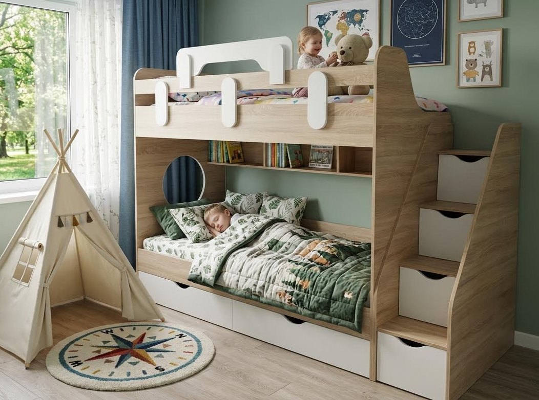 Вместо них - цельный и прочный настил из ЛДСП, который выдерживает сверхвысокую нагрузку и позволяет расположиться даже взрослому с ребенком.