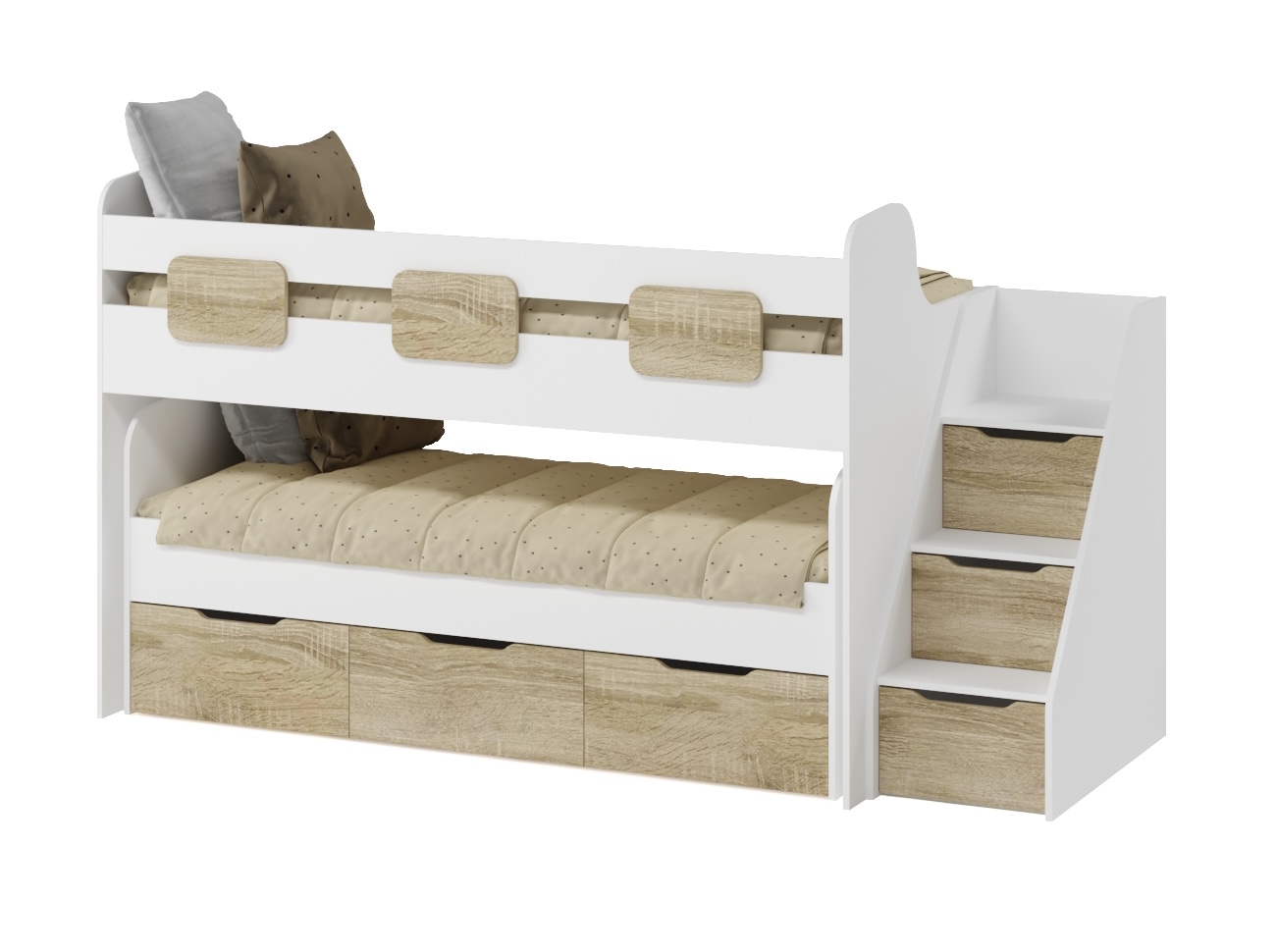 Белый цвет мебели в сочетании с природными оттенками цвета "дуб сонома" отлично подходит разнополым детям.