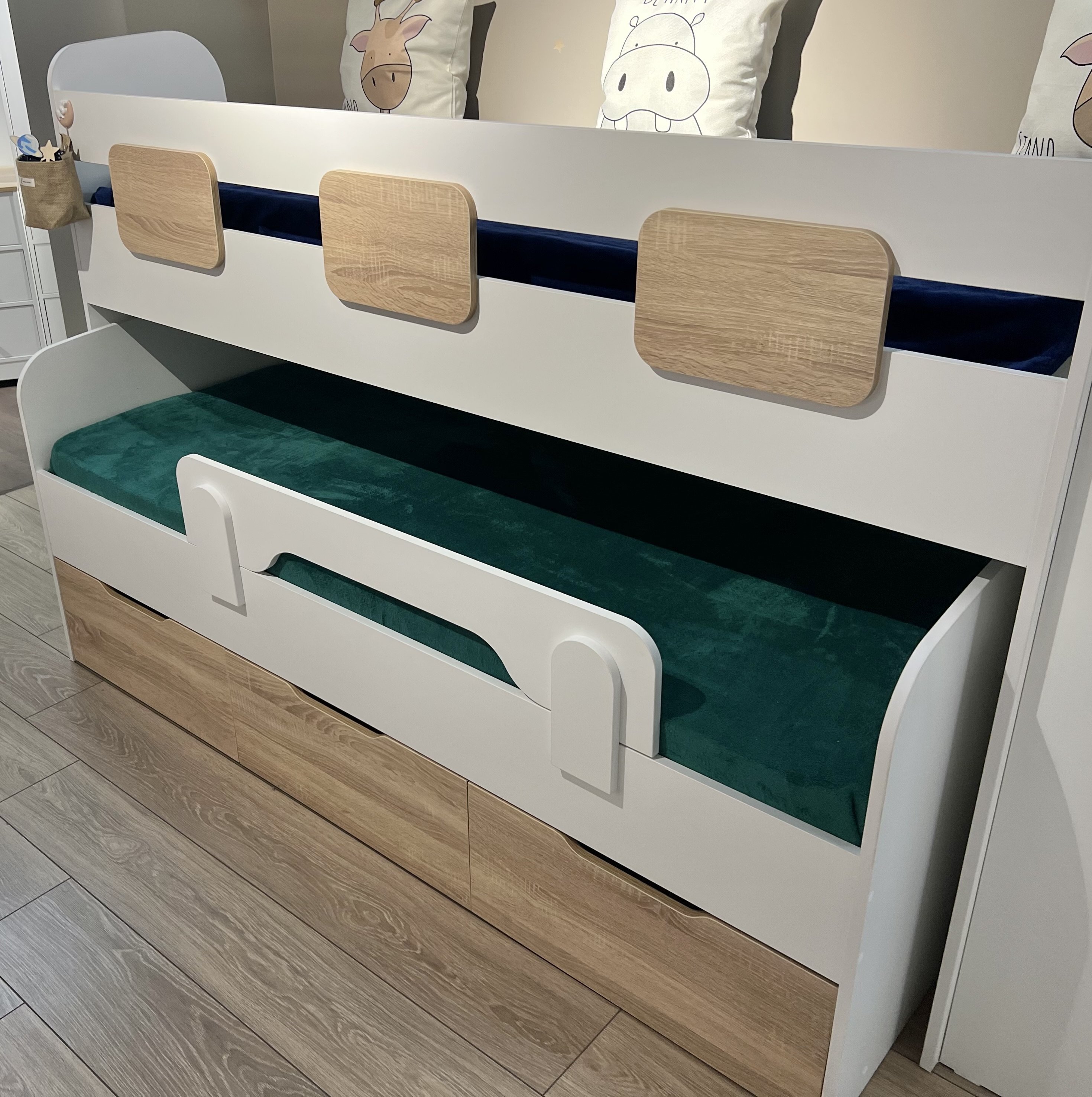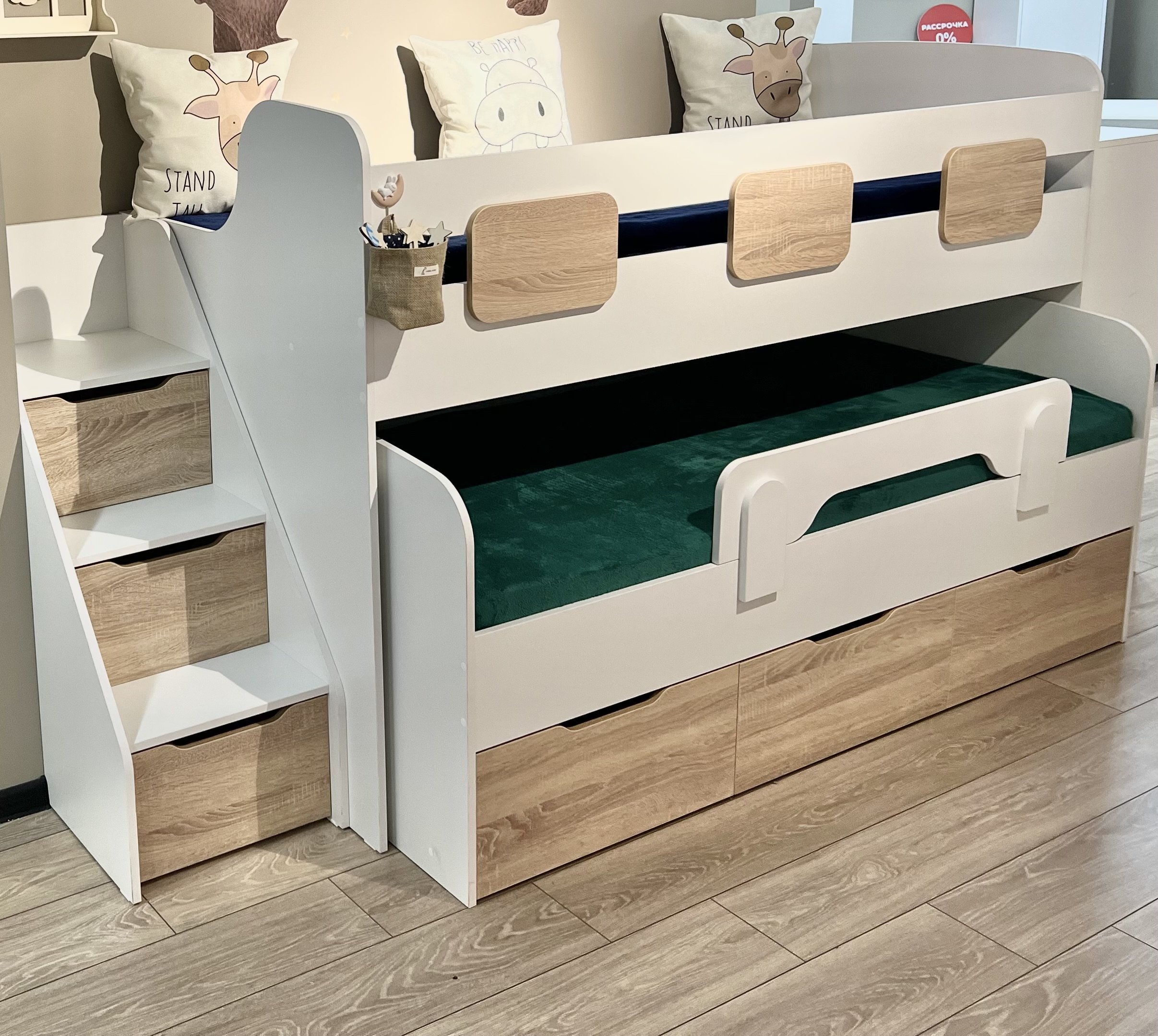Представляем идеальное решение для активной детской комнаты - невысокая двухъярусная кровать с выдвижным спальным местом.