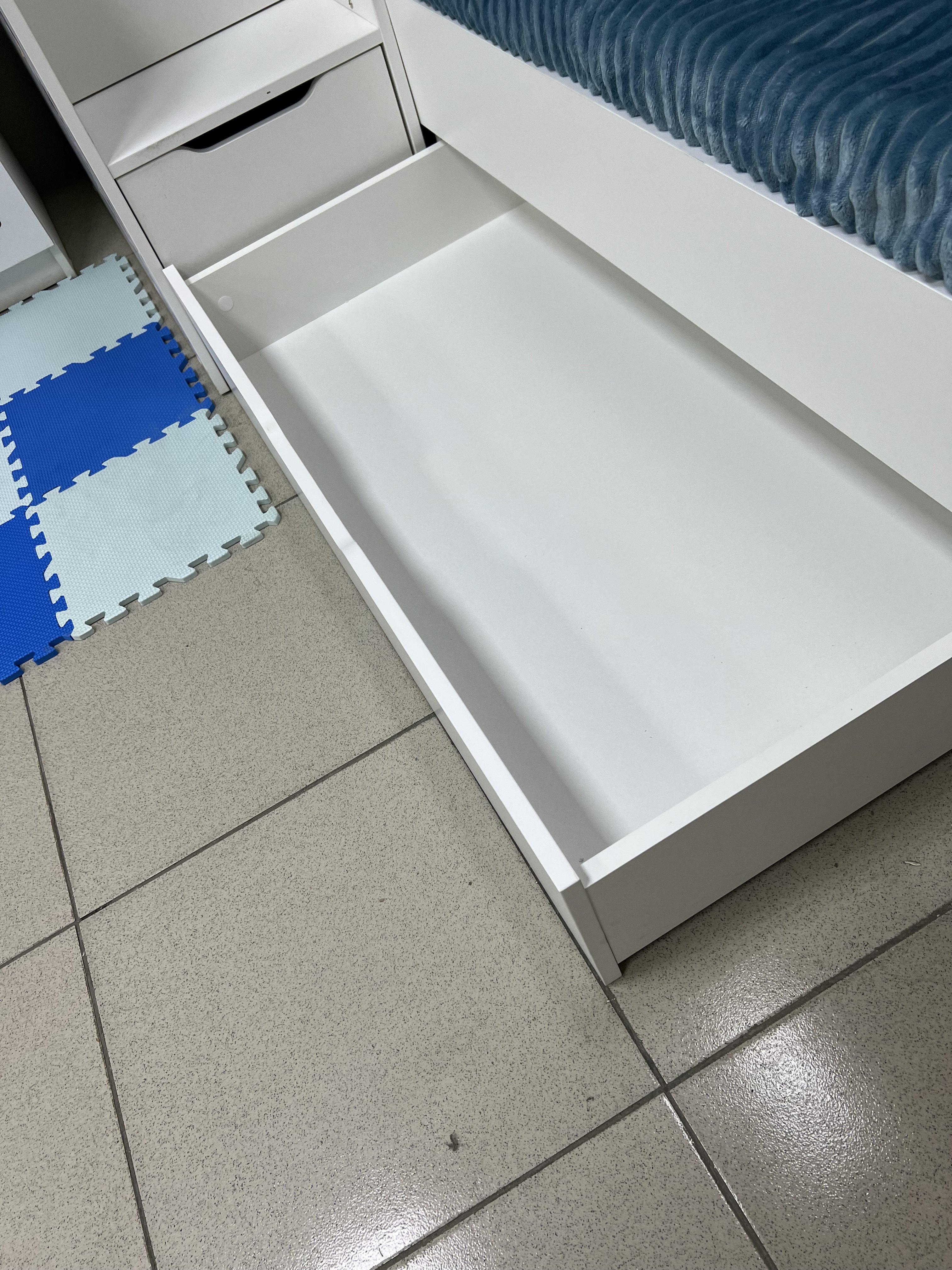 * В нижнюю кровать встроен выдвижной ящик для белья и игрушек.