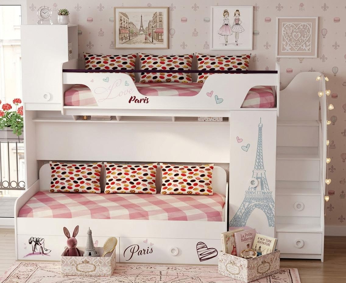 В кровать встроен шкаф для размещения одежды (внутри шкафа имеются штанга для белья и полки) и удобная лестница с ящиками для игрушек.
