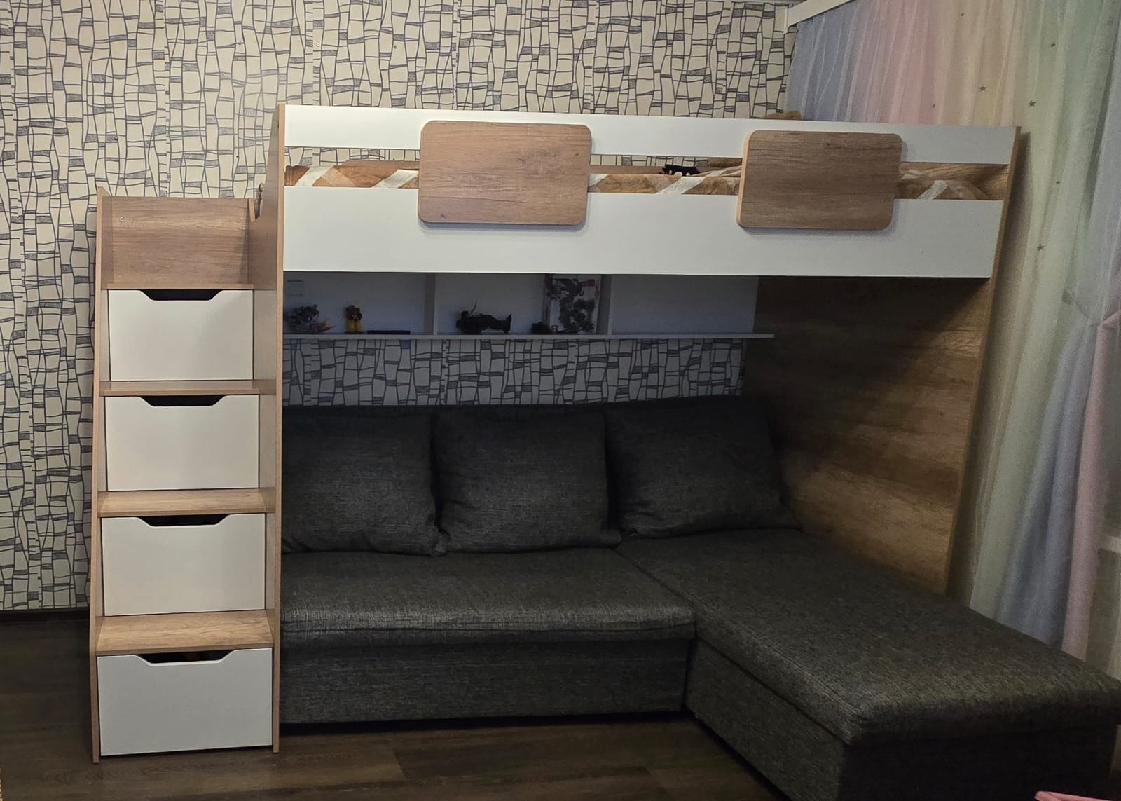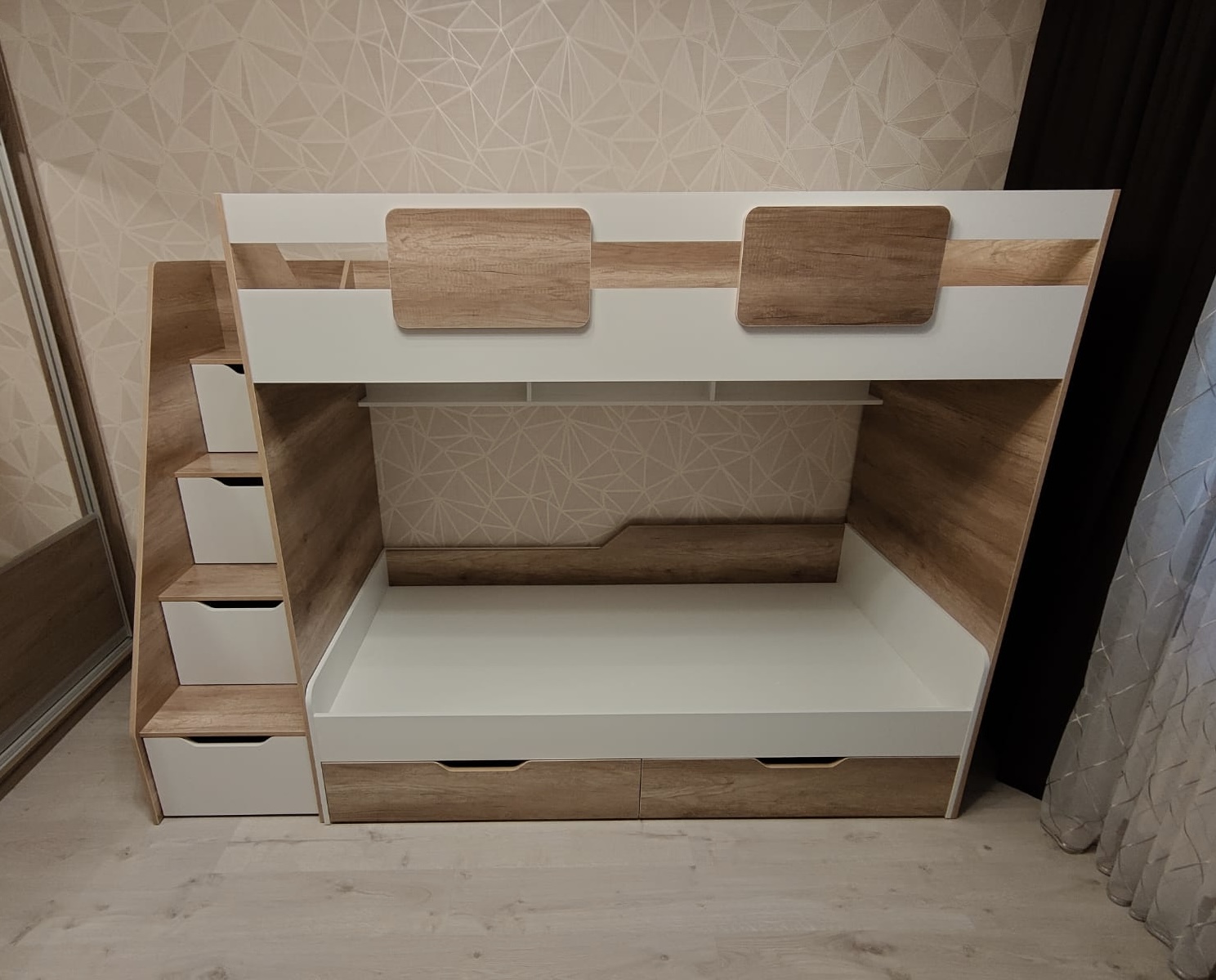 В лестницу встроены выдвижные ящики для игрушек - удобно и практично.
