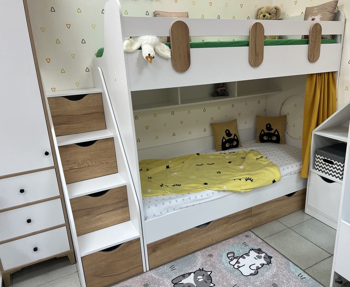 Выдвижные ящики в нижней кровати изготовлены с применением метабоксов, что делает изделие практичным и надежным.
