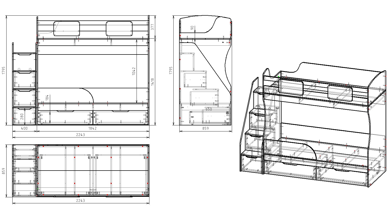 Габариты кровати: ширина с учетом лестницы 2343, высота 1795, глубина 859 мм