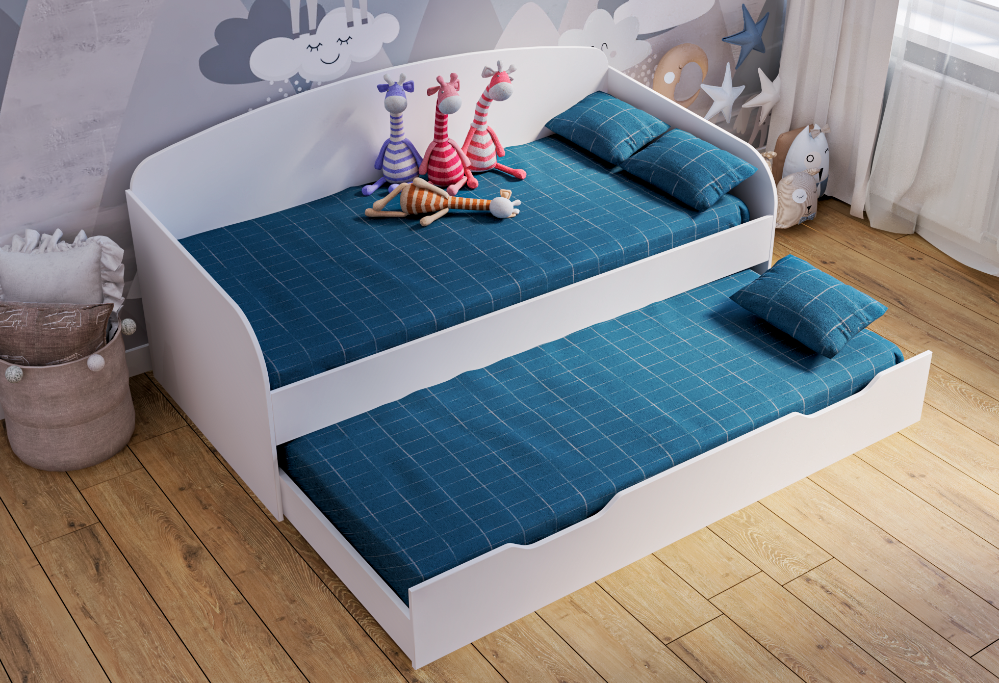 Нижняя кровать на выкатных роликах (при желании кровать можно выдвинуть полностью и поставить в другое место).