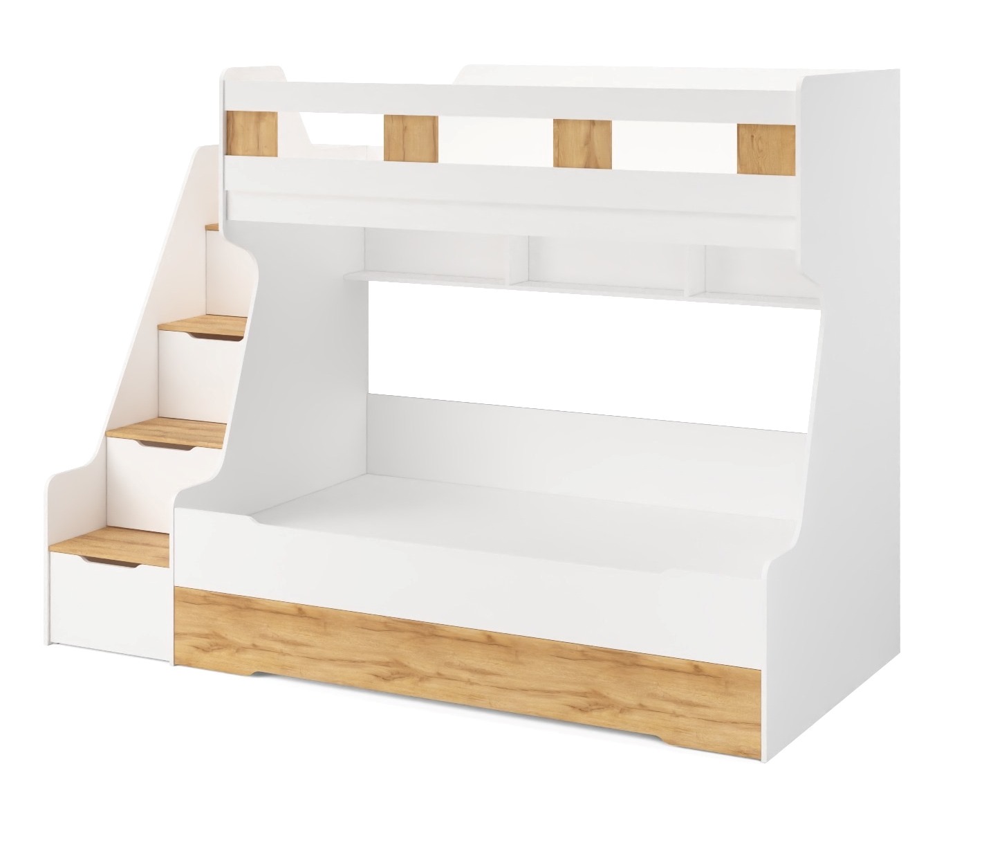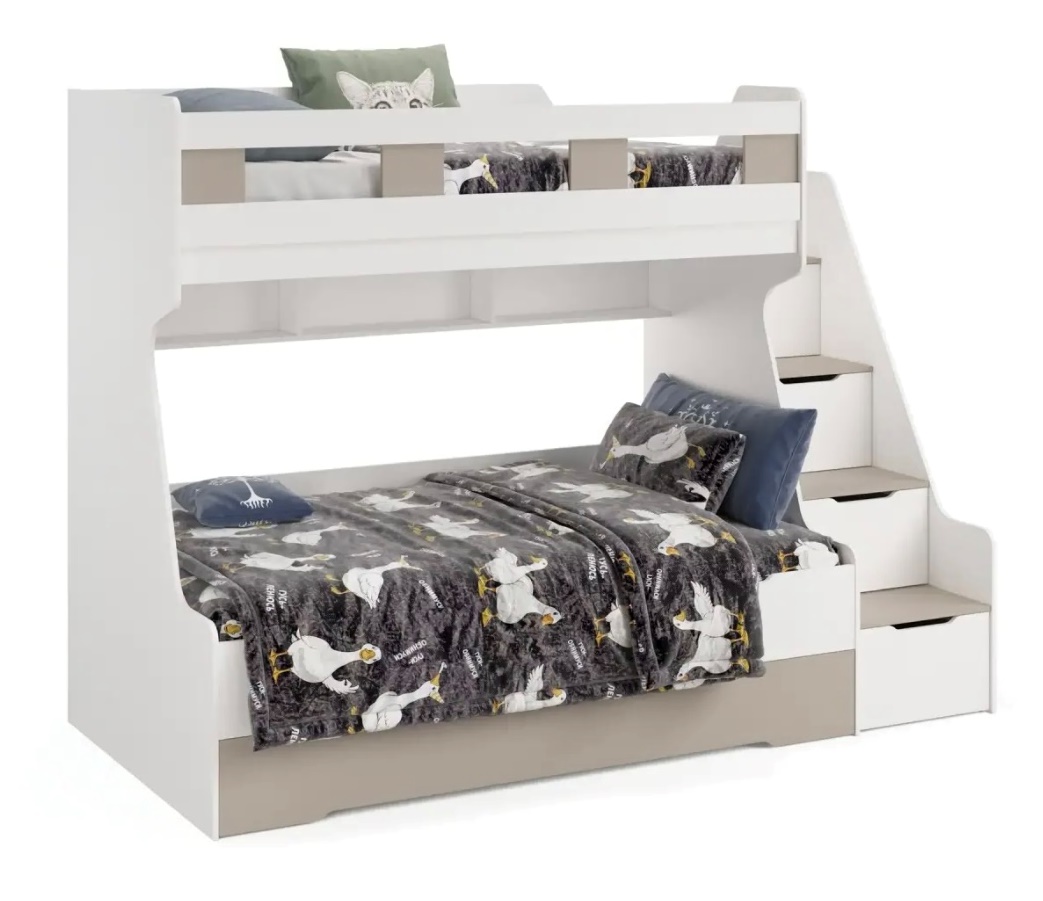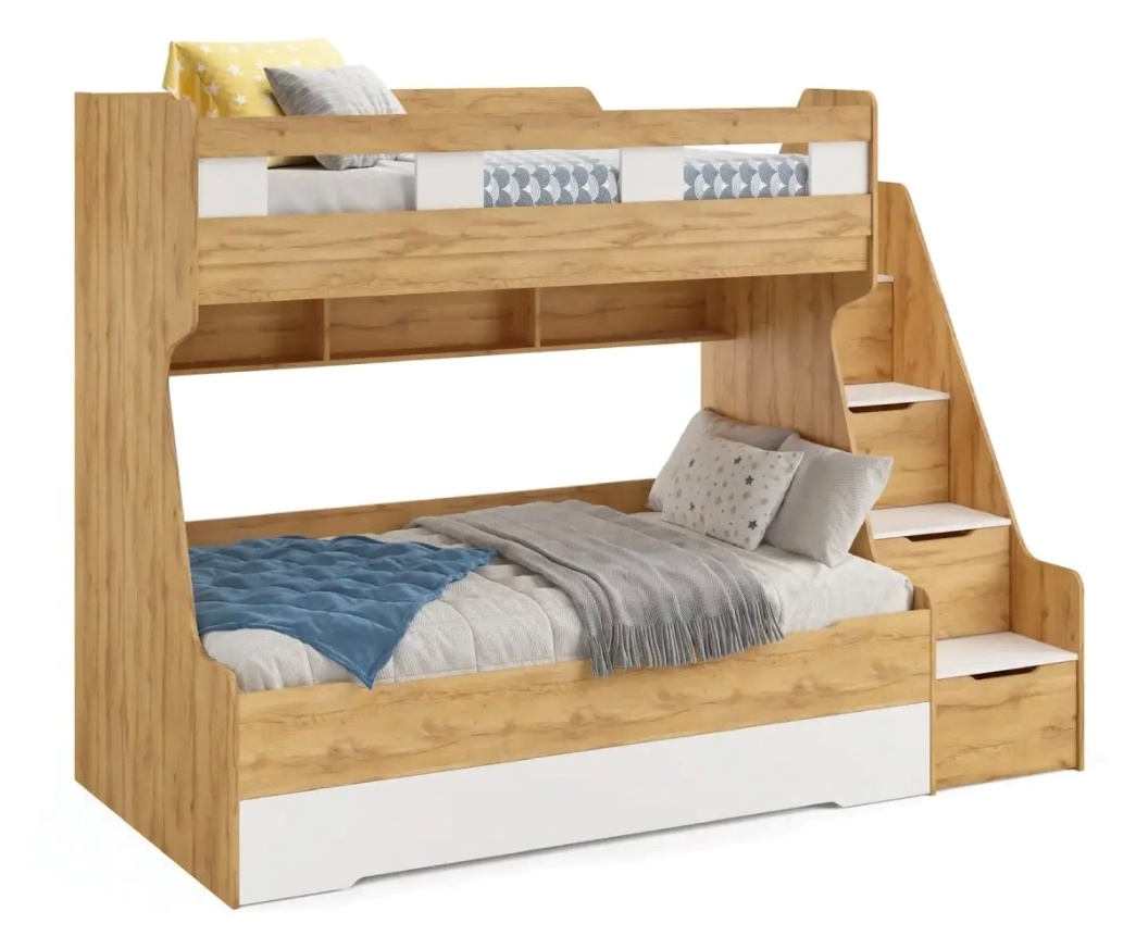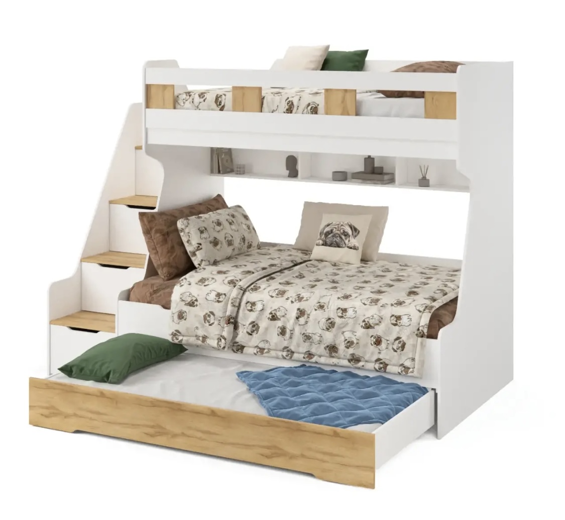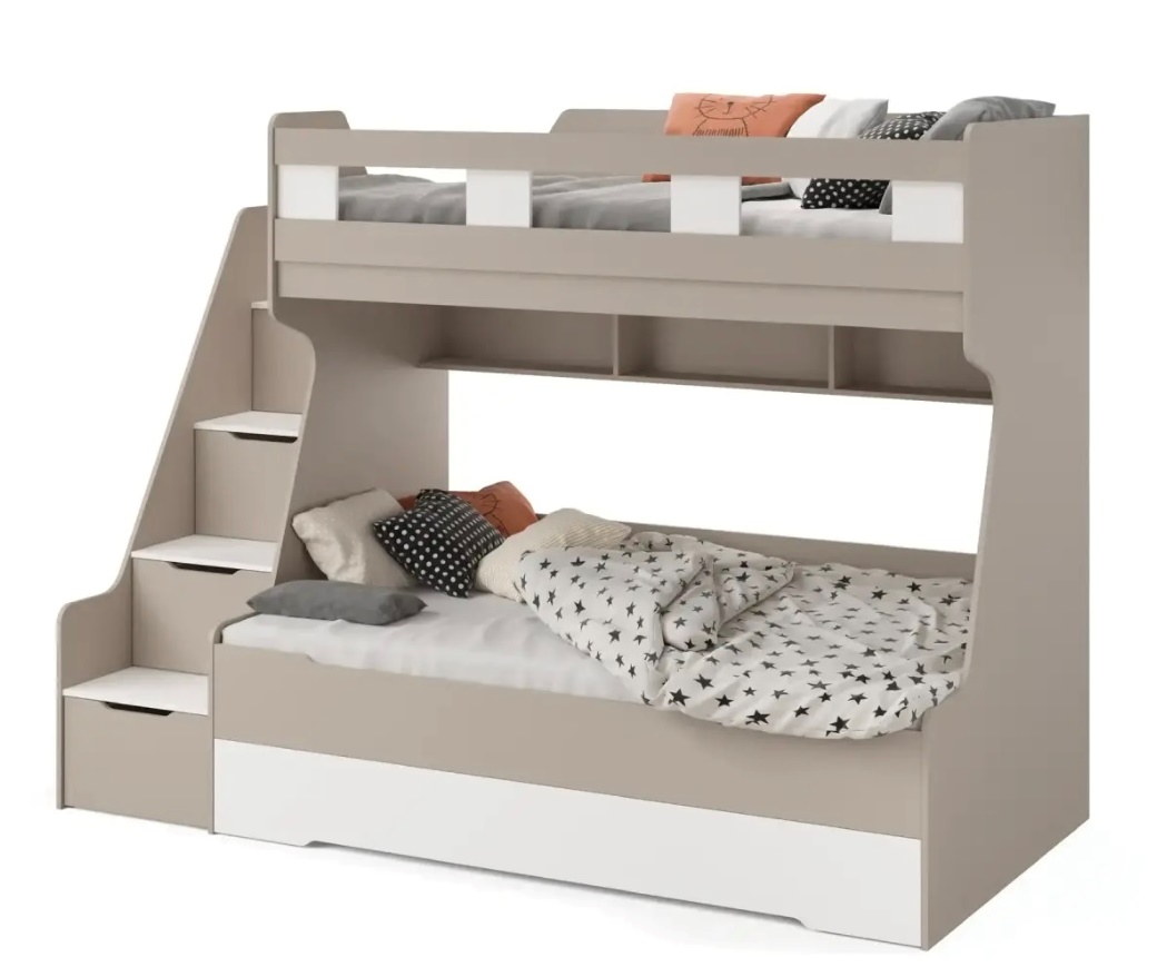 Высокая нагрузка на спальные места. Дополнительное выдвижное спальное место. Удобная лестница. Высокий, безопасный бортик |