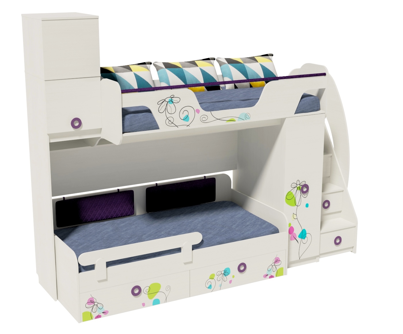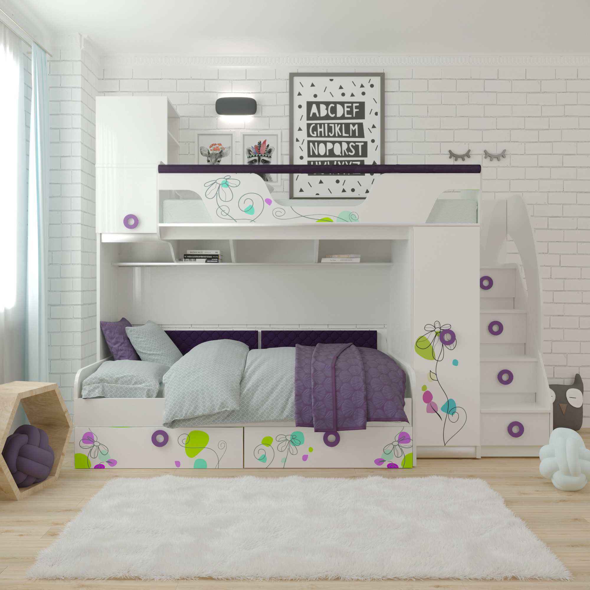 В кровать встроен шкаф для размещения одежды (внутри шкафа имеются штанга для белья и полки) и удобная лестница с ящиками для игрушек.