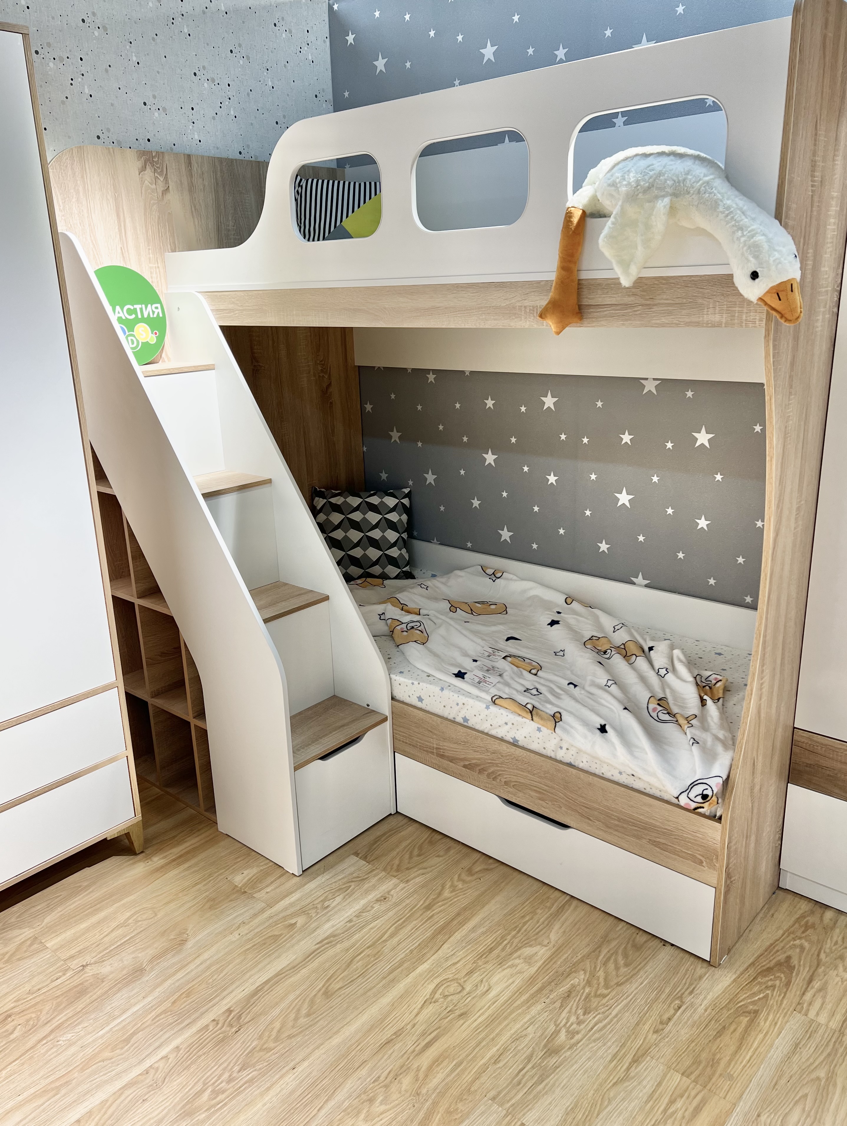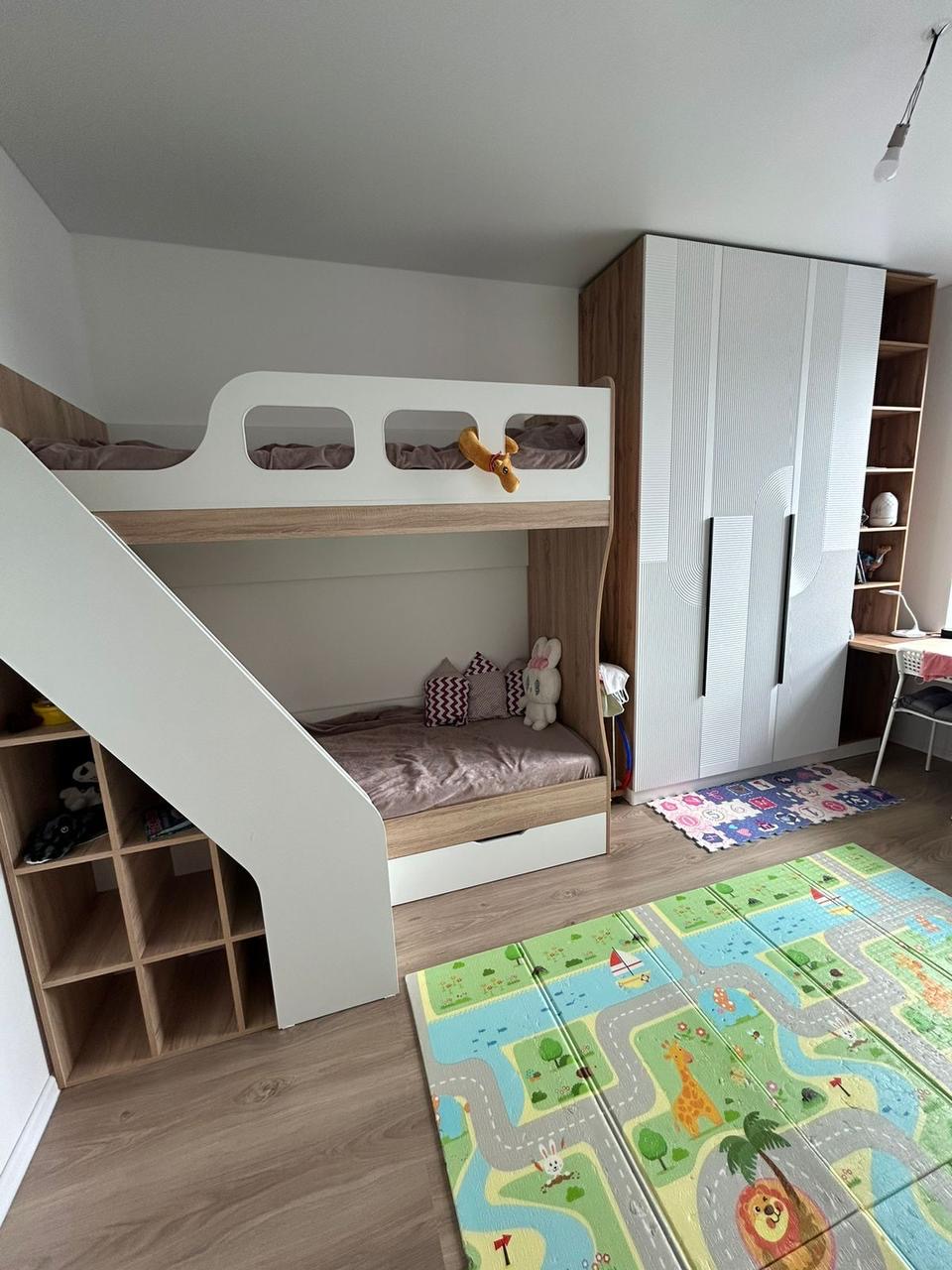 В нижнюю кровать встроен выдвижной ящик для белья и игрушек.