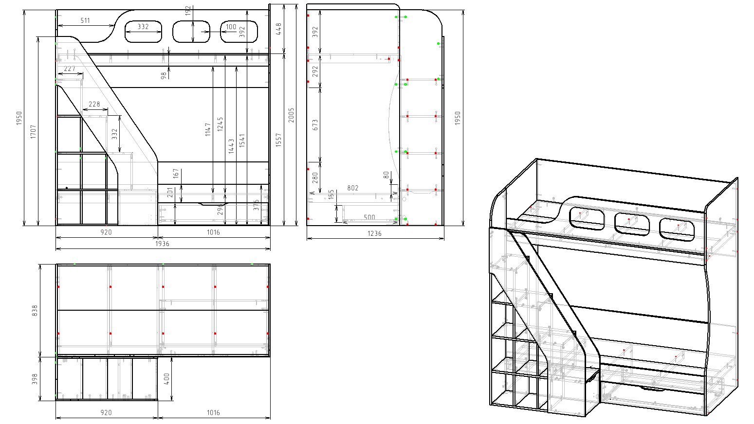 Габариты кровати: ширина 1936 х высота 1950 х глубина с учетом лестницы 1236 мм