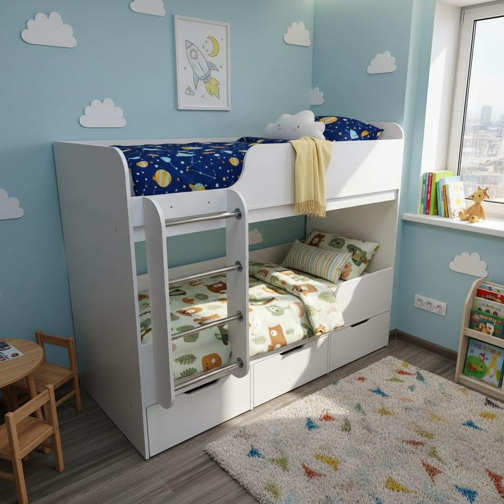 Компактная двухъярусная кровать Малыши Двойняшки создана специально для небольших помещений.