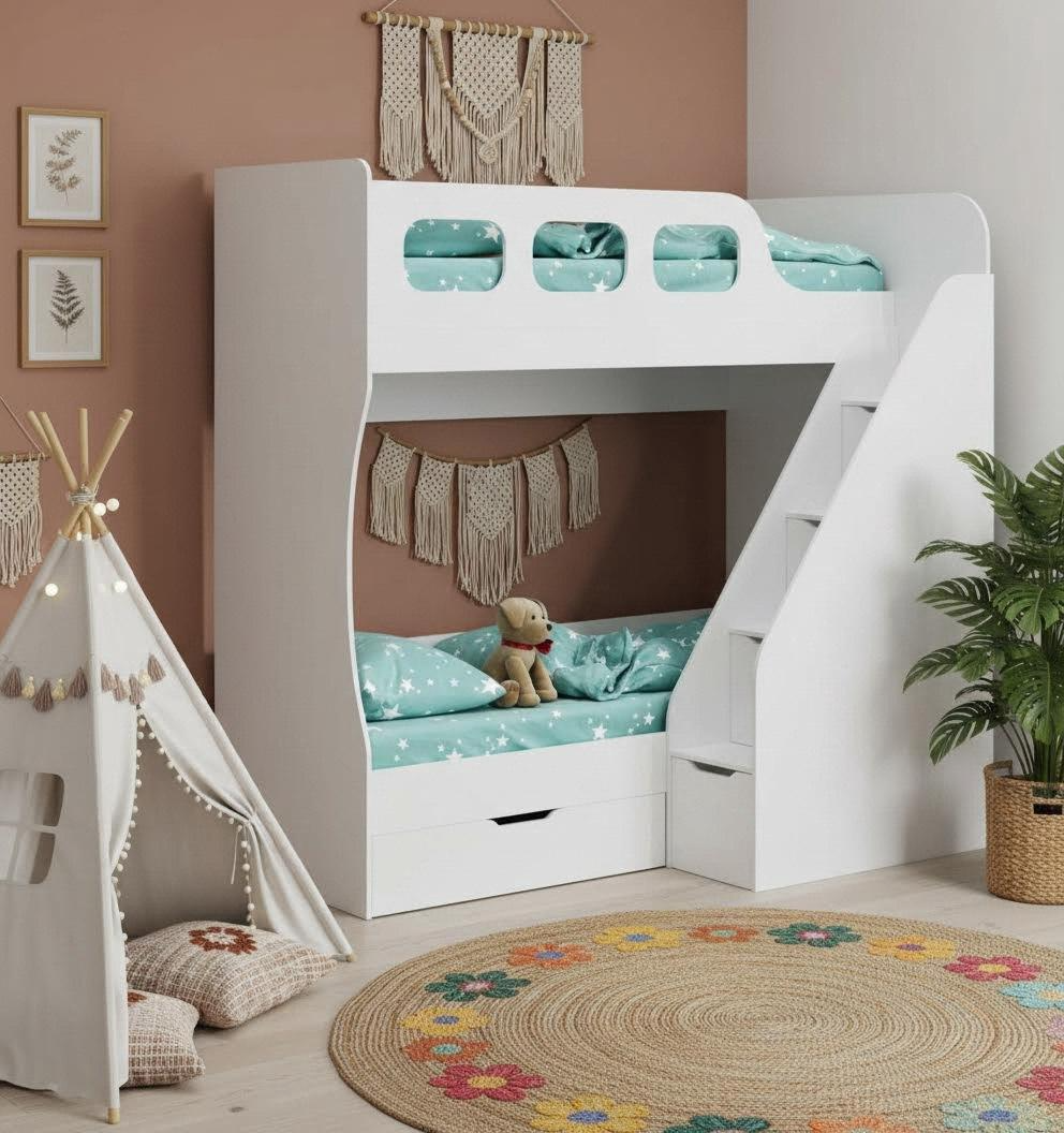 * В нижнюю кровать встроен выдвижной ящик для белья и игрушек.