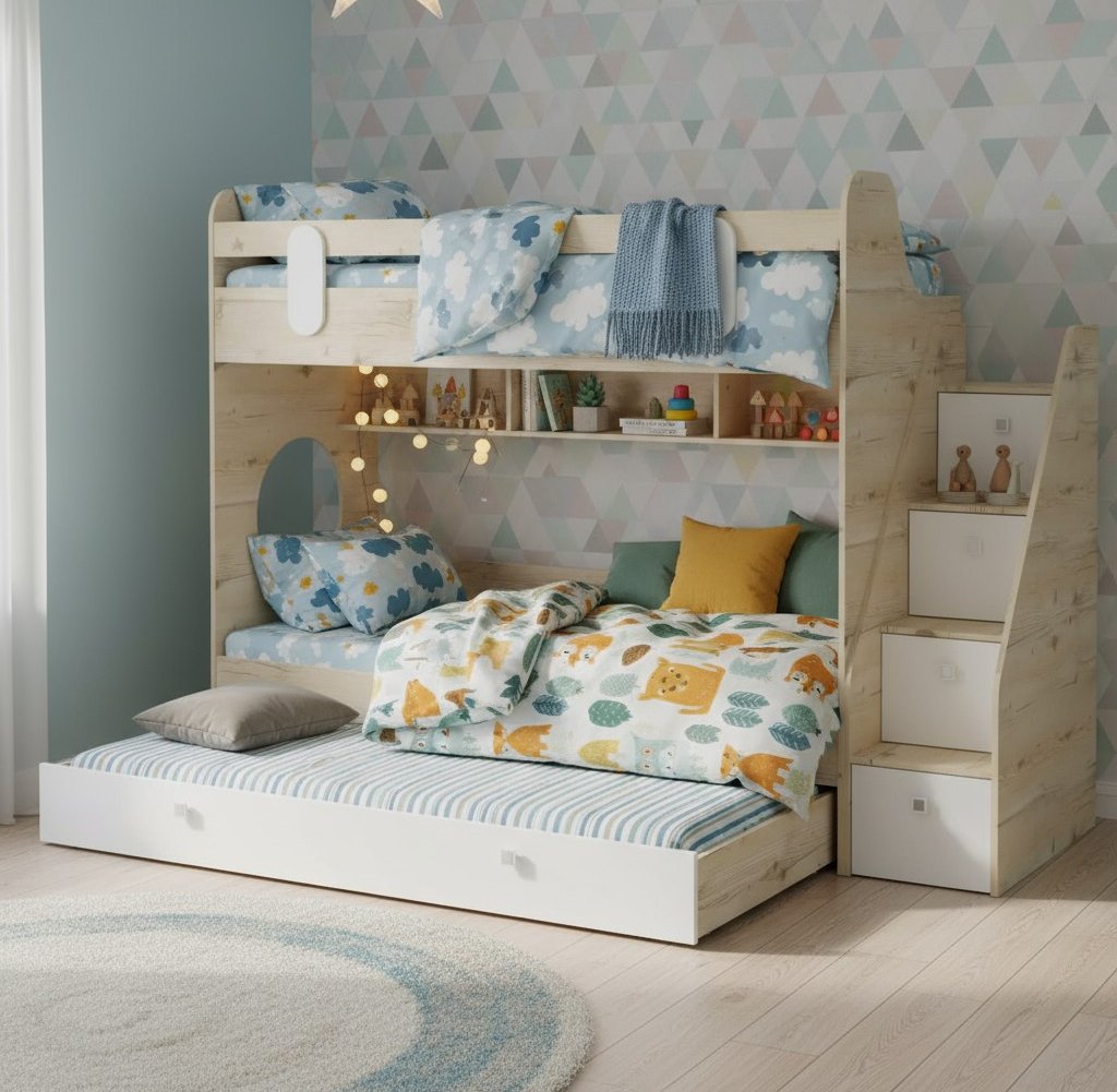 Особое внимание уделяется безопасности: лестница с ящиками обеспечивает не только удобный подъем на верхний ярус, но и дополнительное место для хранения игрушек, постельного белья или одежды. Это значительно упрощает организацию детской комнаты.