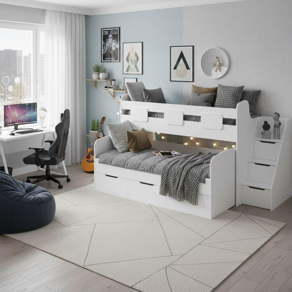- Невысокая конструкция кровати обеспечивает удобный доступ на второй этаж, делая её идеальной даже для самых маленьких детей.