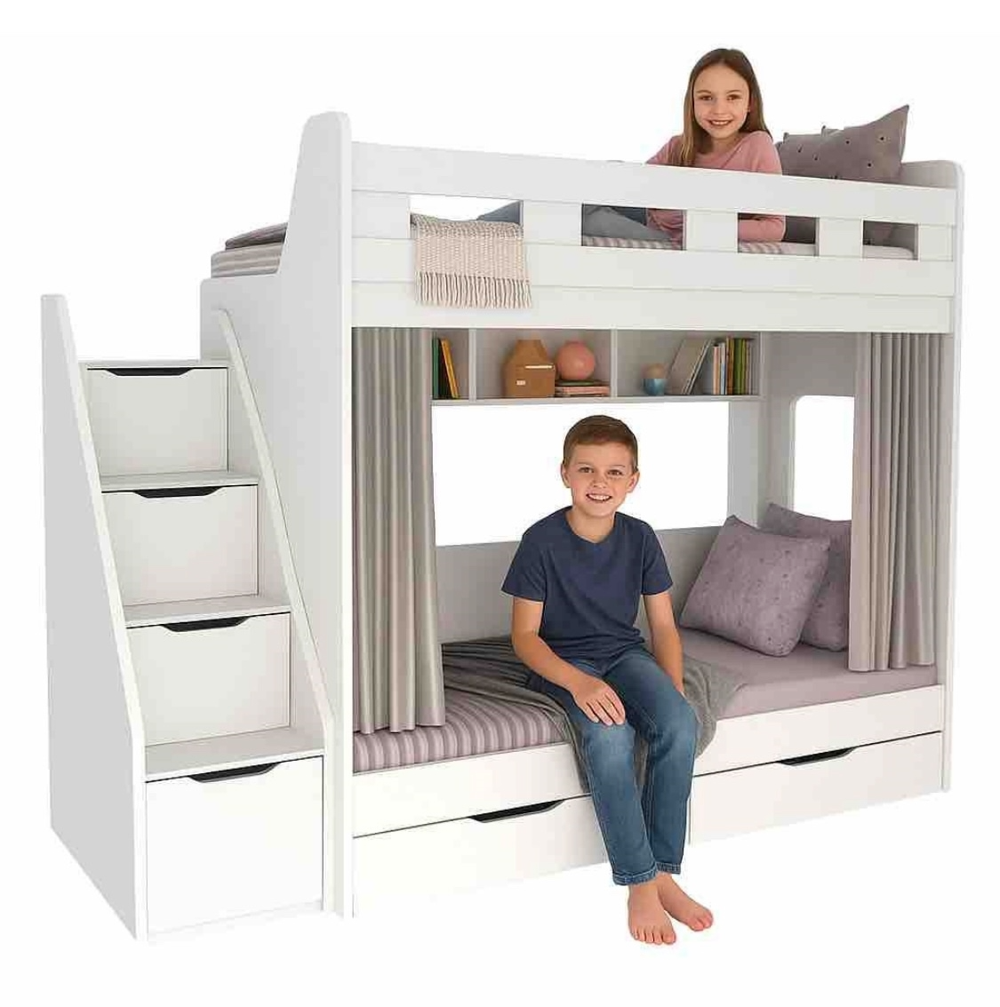 спальное место для двоих, навесная полка для книг и игрушек, вместительные выдвижные ящики под кроватью, а также безопасная лестница расположенная сбоку, обеспечивающая быстрый и удобный доступ на второй этаж, с безопасными ступенями в виде выдвижных ящиков.