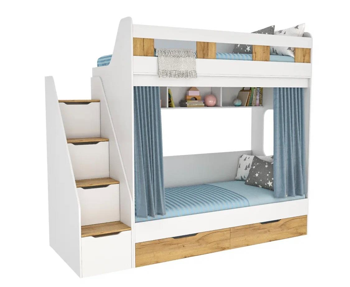 спальное место для двоих, навесная полка для книг и игрушек, вместительные выдвижные ящики под кроватью, а также безопасная лестница расположенная сбоку, обеспечивающая быстрый и удобный доступ на второй этаж, с безопасными ступенями в виде выдвижных ящиков.