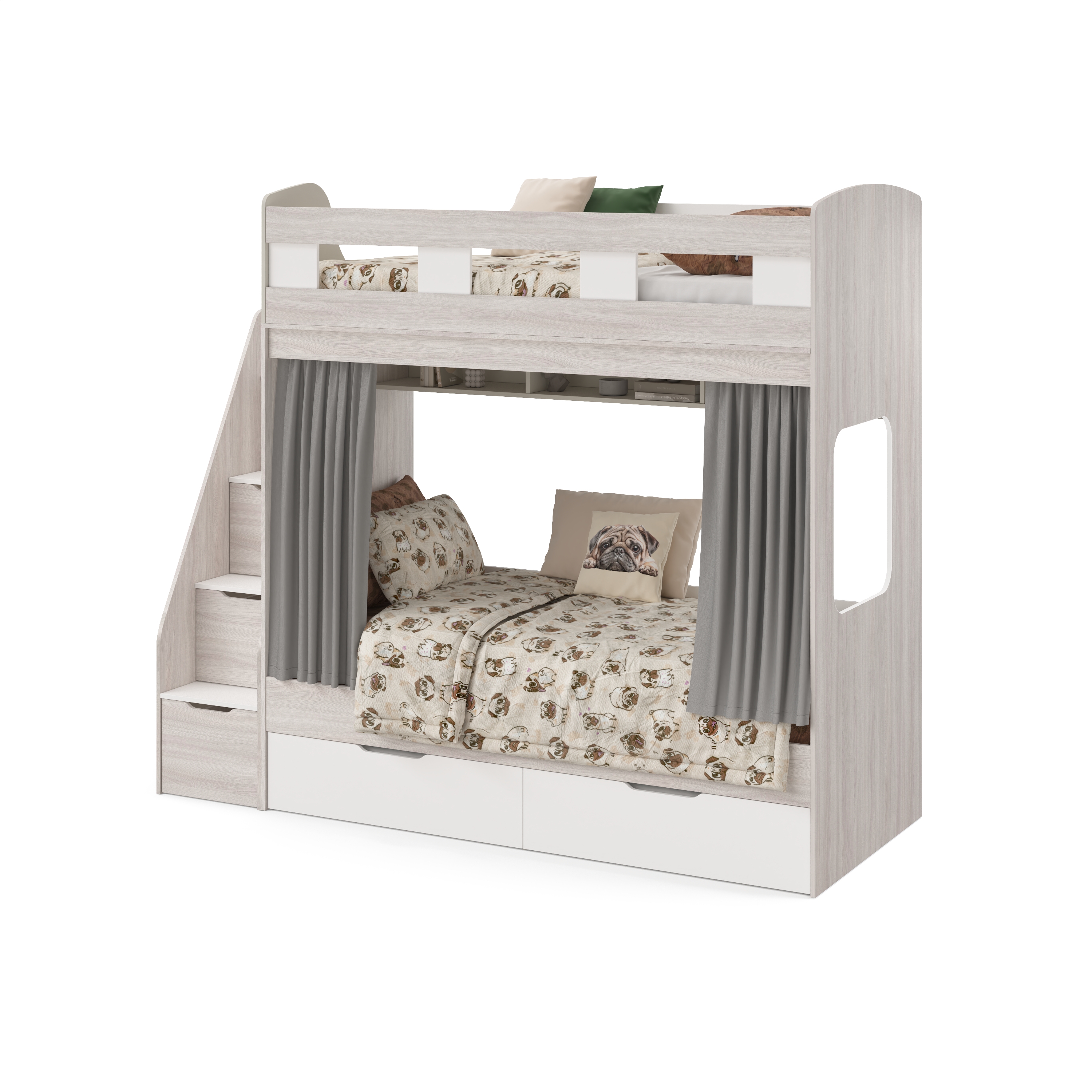 спальное место для двоих, навесная полка для книг и игрушек, вместительные выдвижные ящики под кроватью, а также безопасная лестница расположенная сбоку, обеспечивающая быстрый и удобный доступ на второй этаж, с безопасными ступенями в виде выдвижных ящиков.