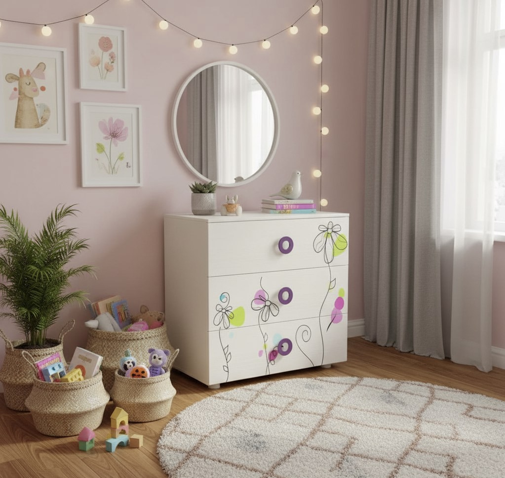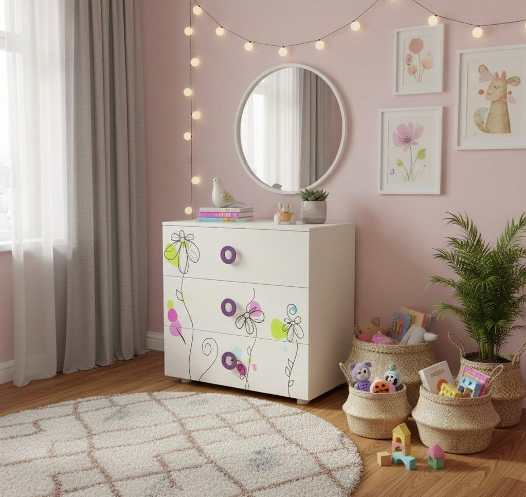 Комод выполнен из сертифицированного, качественного, экологически чистого ЛДСП Е0,5 в белом цвете с принтом.