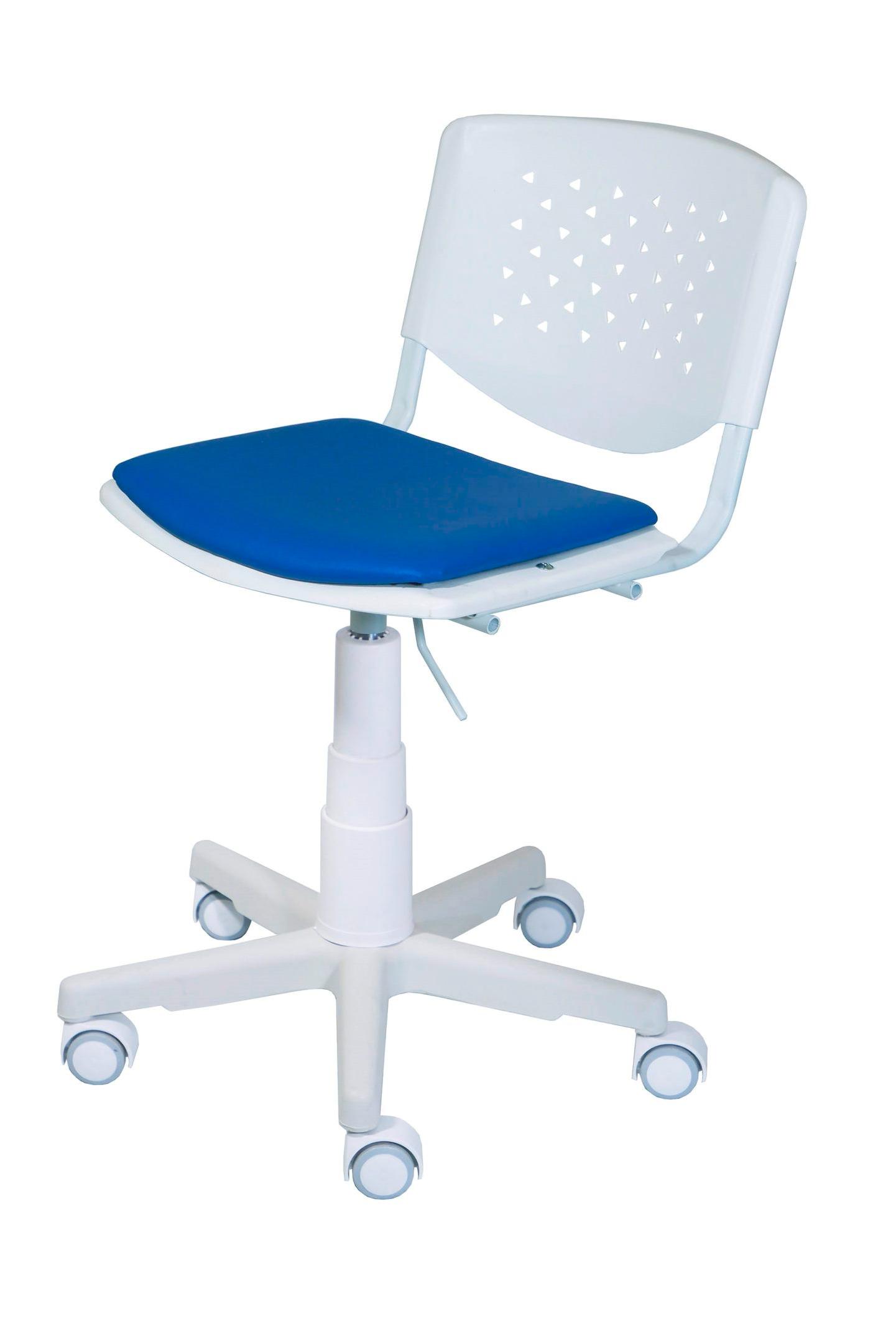 Кресло на белом каркасе в белом пластике с мягкой накладкой на сидении из заменителя кожи.