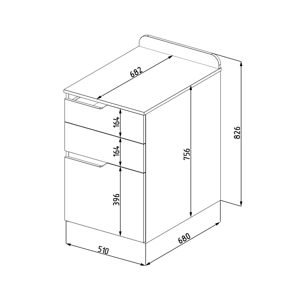 Габариты тумбы: ширина 510, общая высота 826, глубина 682 мм