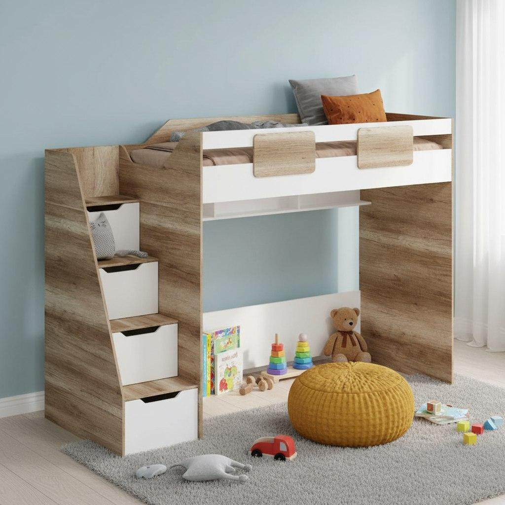 В лестницу встроены выдвижные ящики для игрушек - удобно и практично.