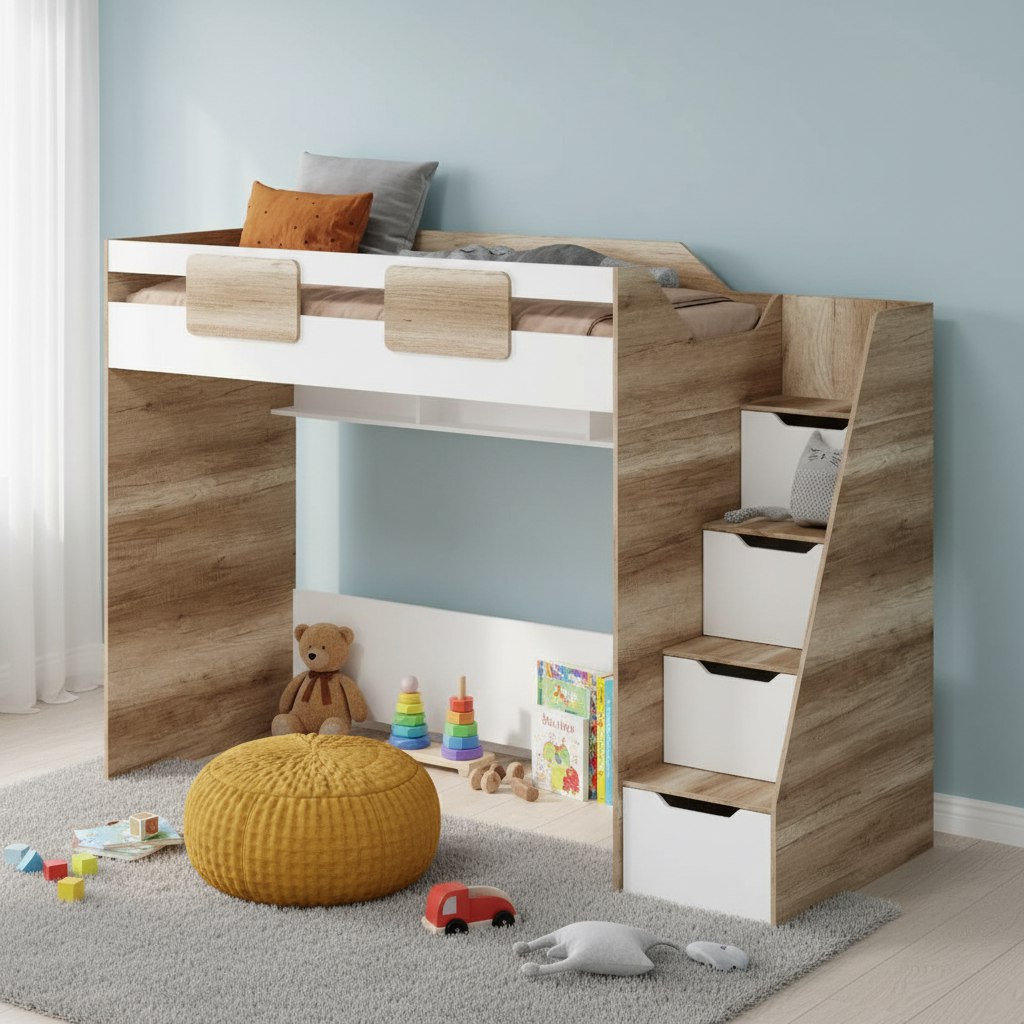 Вместо них - цельный и прочный настил из ЛДСП, который выдерживает сверхвысокую нагрузку и позволяет расположиться даже взрослому с ребенком.