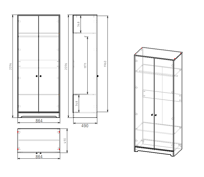 Габариты шкафа: ширина 864, глубина 490, высота 2096 мм