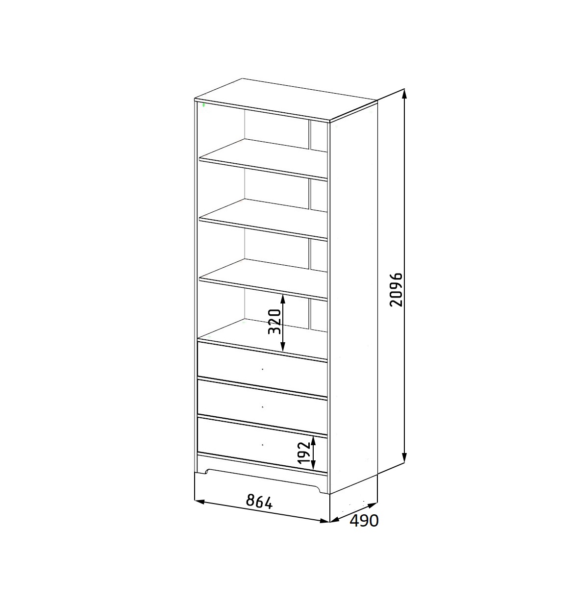 В стеллаж встроены три выдвижных ящика на направляющих скрытого монтажа с доводчиками.