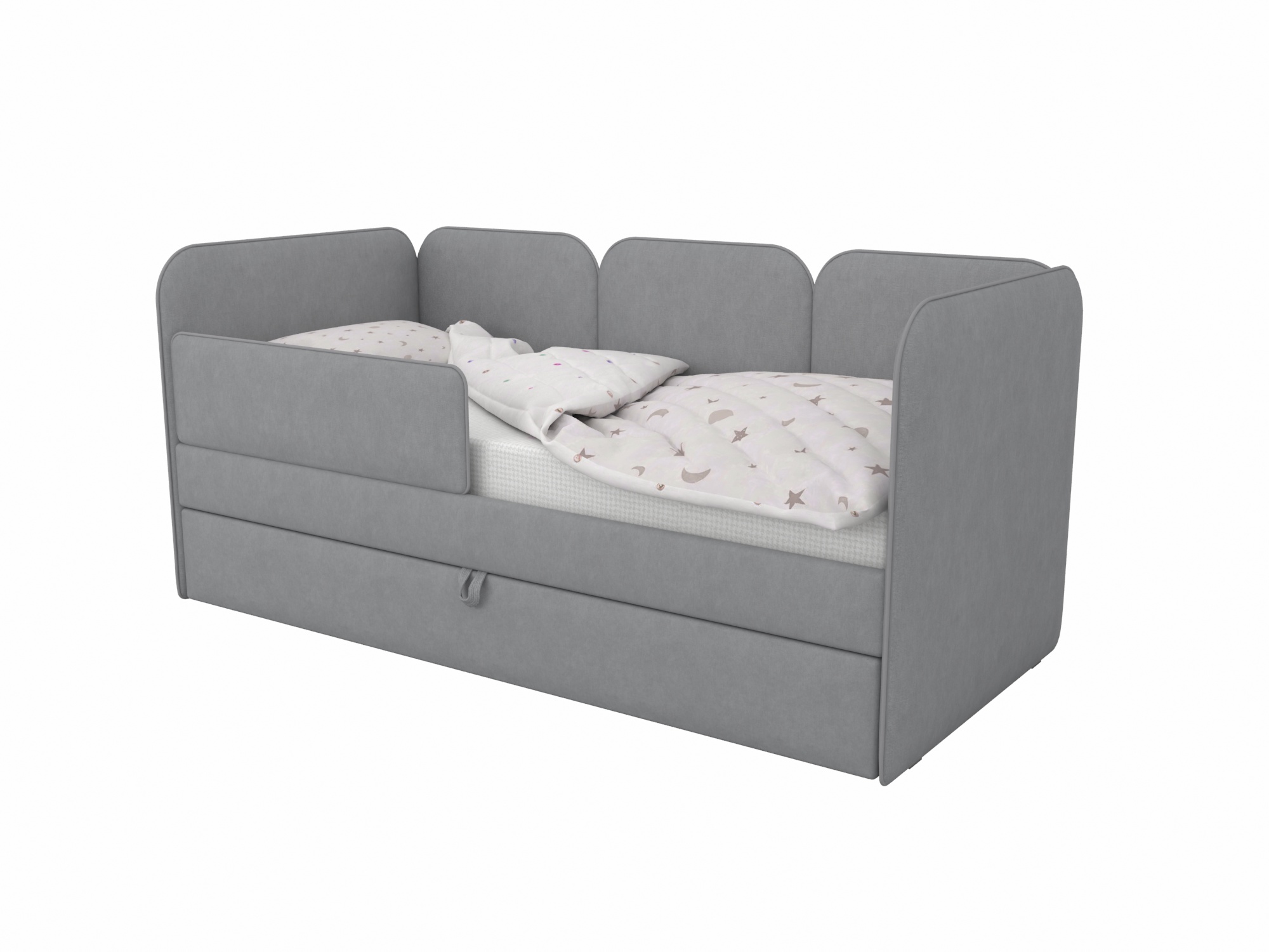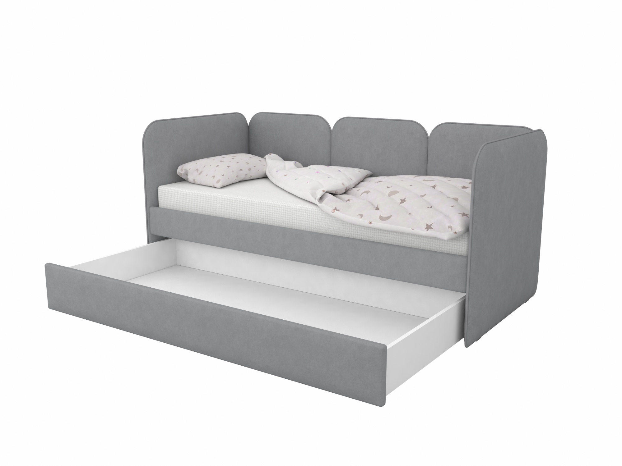 Мягкая кровать с выразительными скругленными спинками - универсальная база для интерьеров детских комнат.