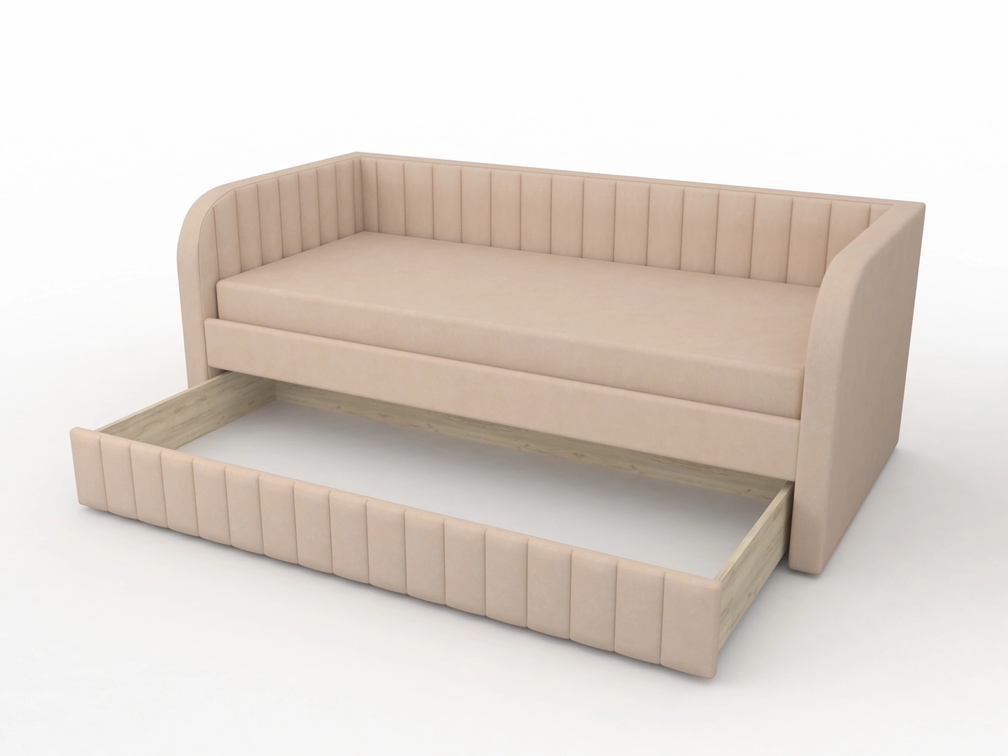 Кровать оснащена большим ящиком для хранения постельного белья или выкатным спальным местом на ваш выбор.