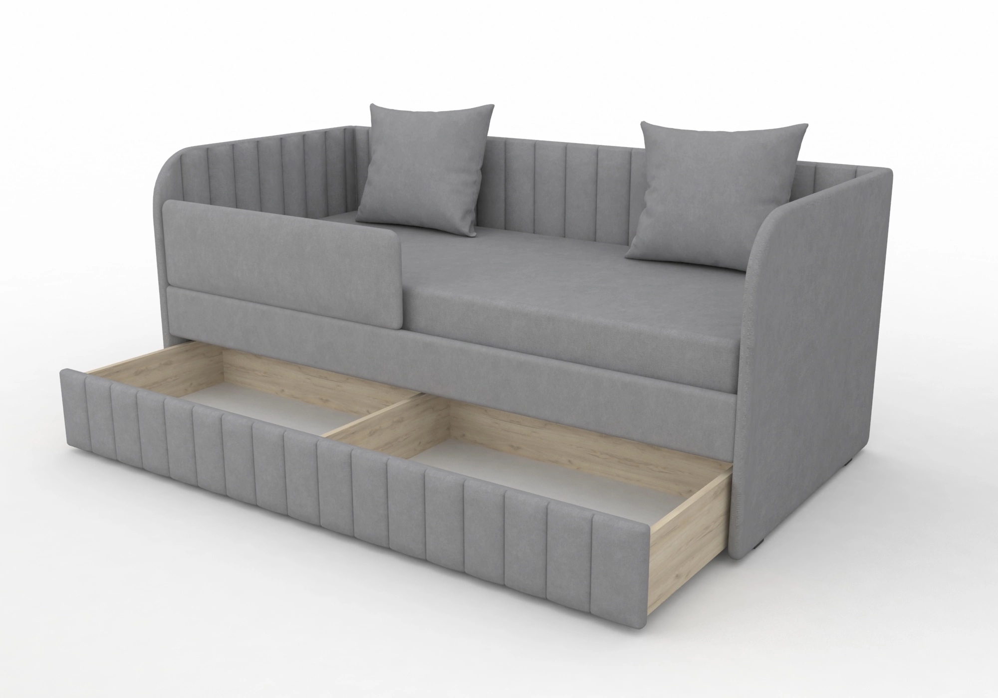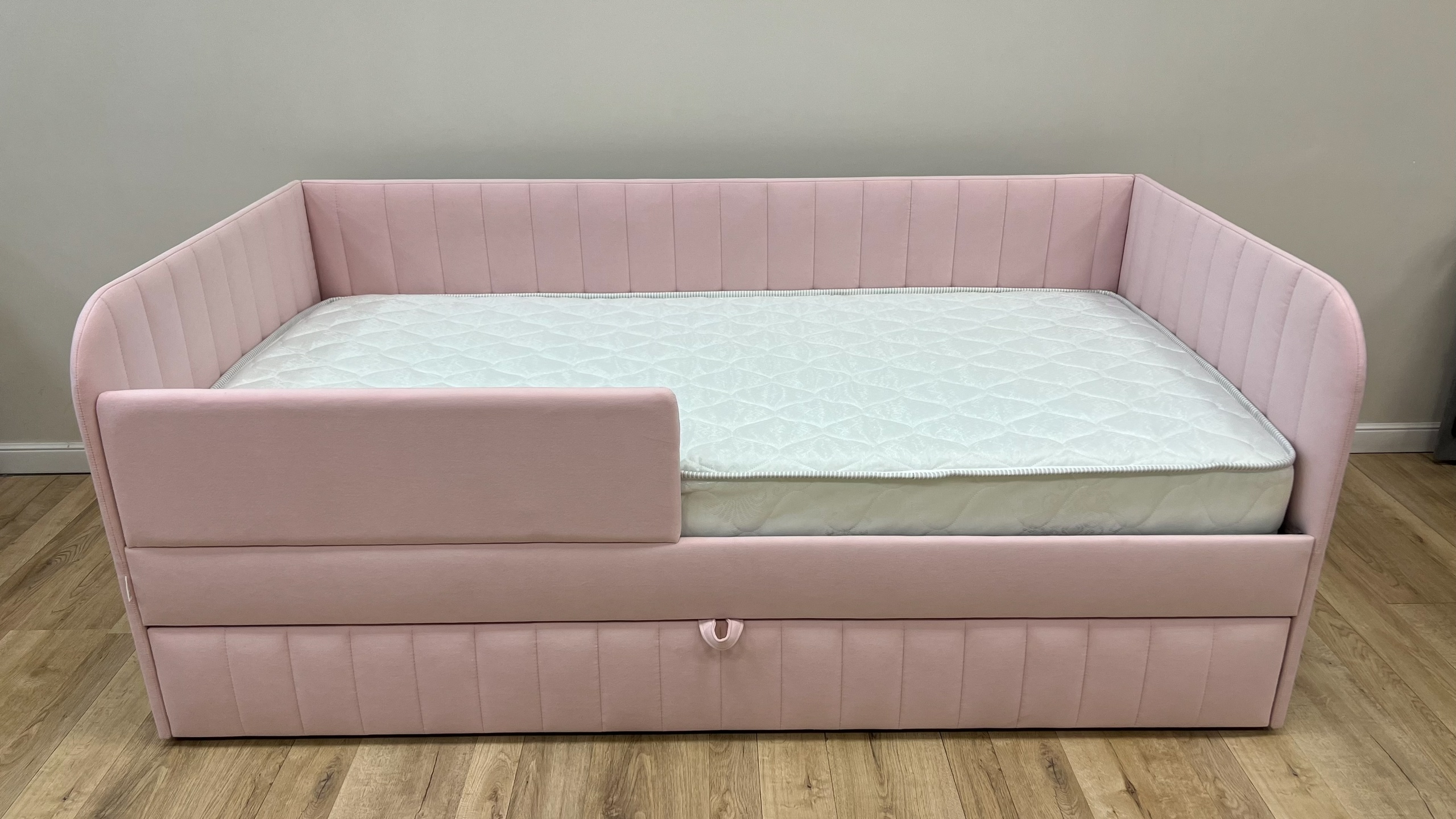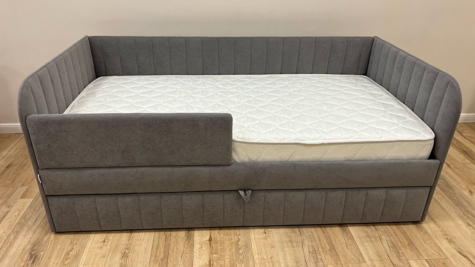 Кровать полностью безопасна для ребенка, так как имеет прочную конструкцию и мягкие подлокотники, которые защитят ребенка от травм.