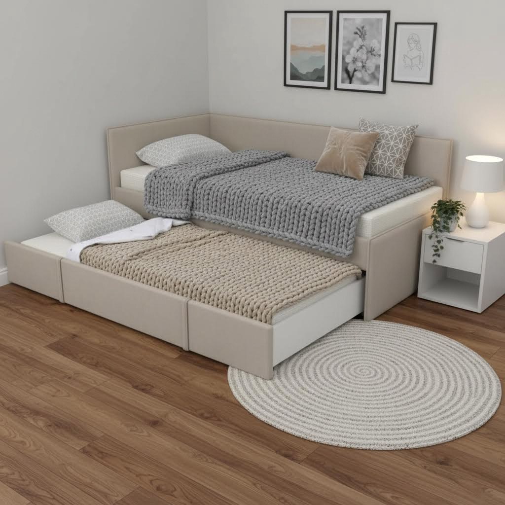 Данная модель оснащена вместительным ящиком, что позволяет использовать его как дополнительное спальное место.