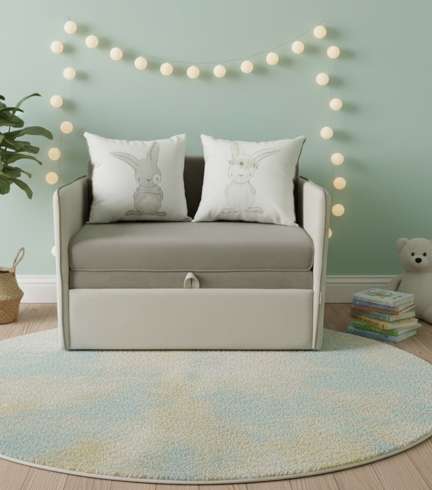 Диван полностью безопасен для ребенка, так как имеет прочную конструкцию и мягкие овальные подлокотники, которые защитят ребенка от травм.