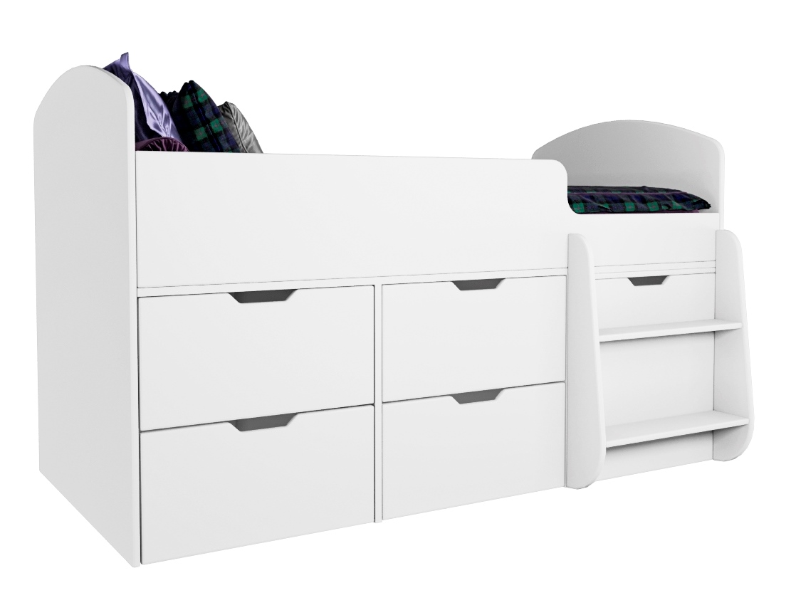 Безопасные бортики, удобная выдвижная лестница с внутренними полочками и небольшая высота кровати сделаны специально для детей младшего возраста.