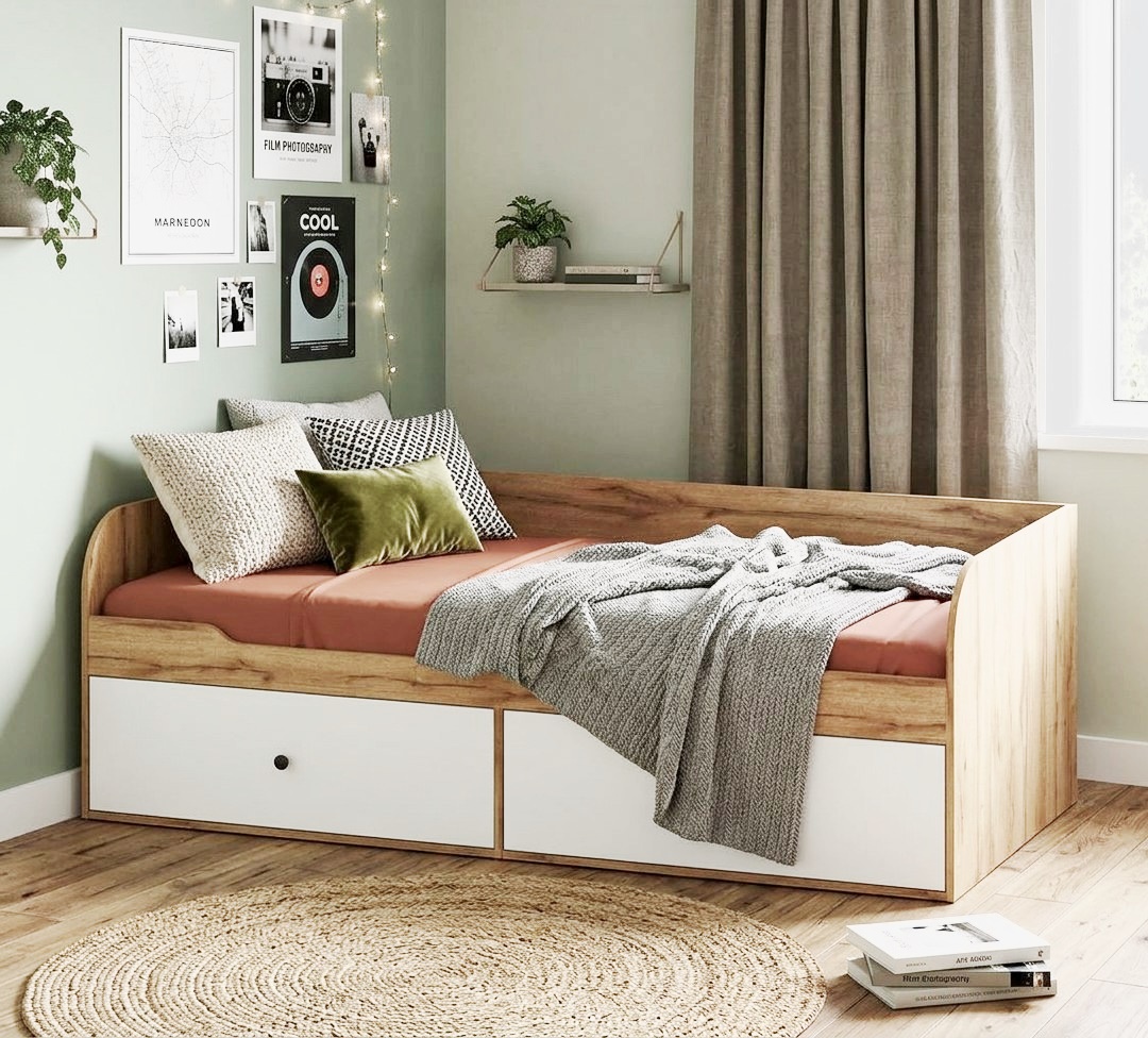 Кровать выполнена из сертифицированного, качественного, экологически чистого ЛДСП класса Е0,5 в сочетании цветов дуб золотистый с белым.