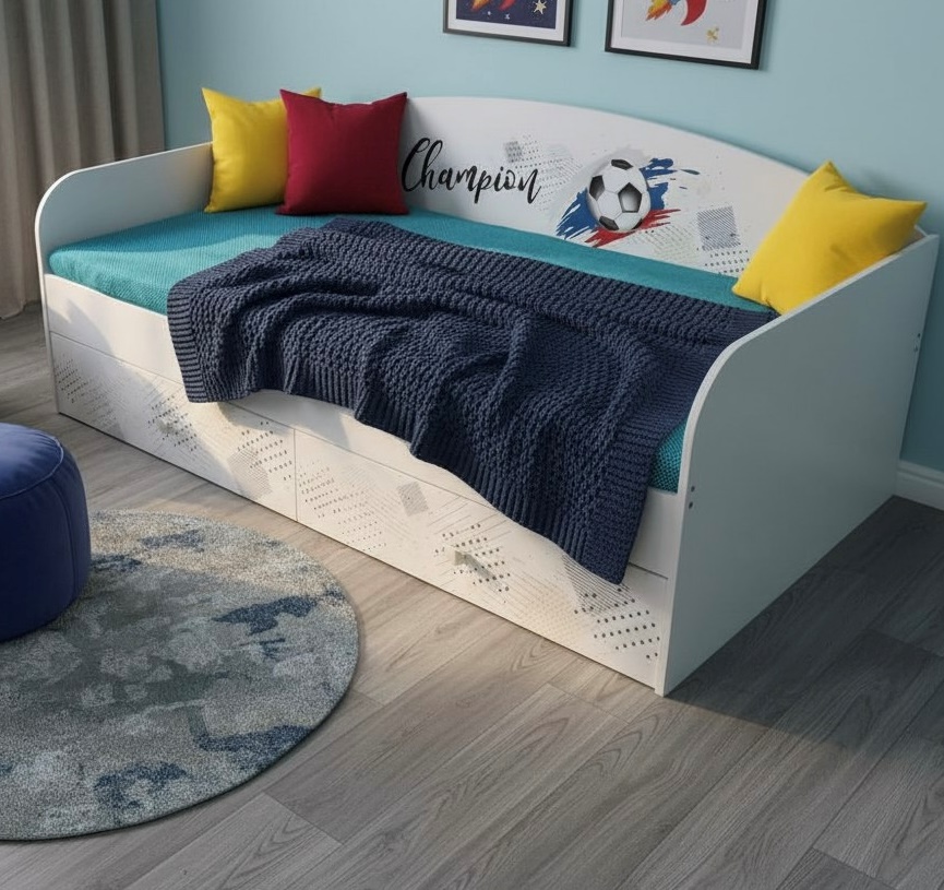 Кровать в современном дизайне превосходно дополнит интерьер комнаты юного спортсмена.