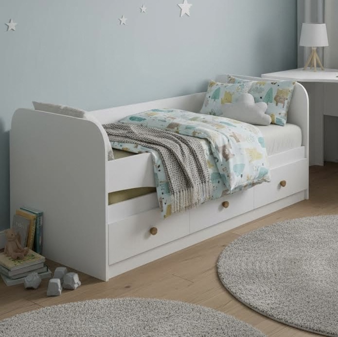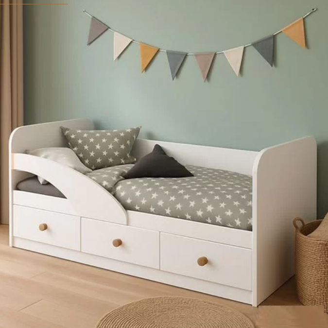 В кровать встроены три выдвижных ящика для белья и игрушек.