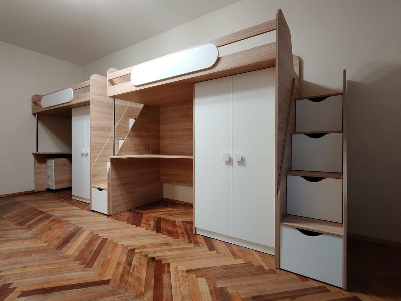Экономия пространства: под кроватью расположен стол с тумбой для учебы и удобная полочка, а рядом – шкаф для хранения вещей.