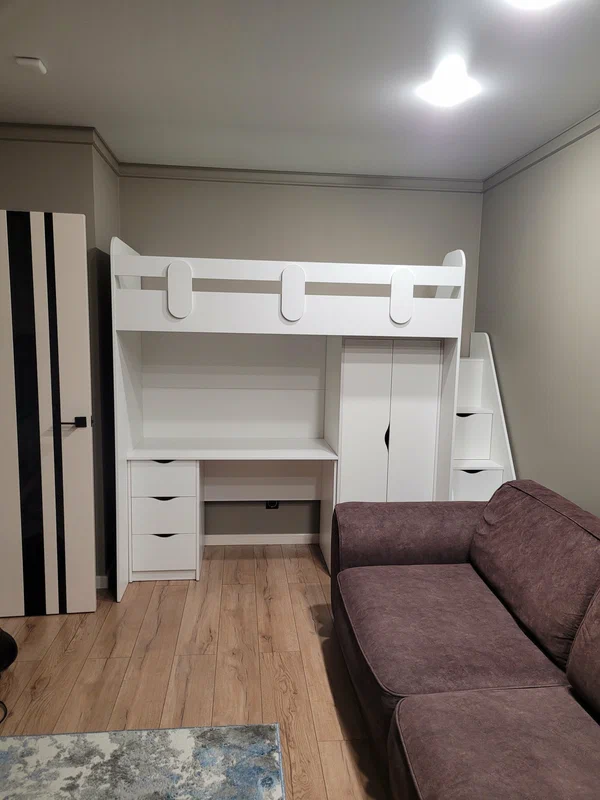 <comment>Так как в комнате мало места, пришлось совместить два чердака и оставить одну лестницу. Очень удобно, что сразу получился полноценный набор для каждого ребенка. Кровать, стол, шкафчик. Очень функционально. Дети довольны! Спасибо </comment>