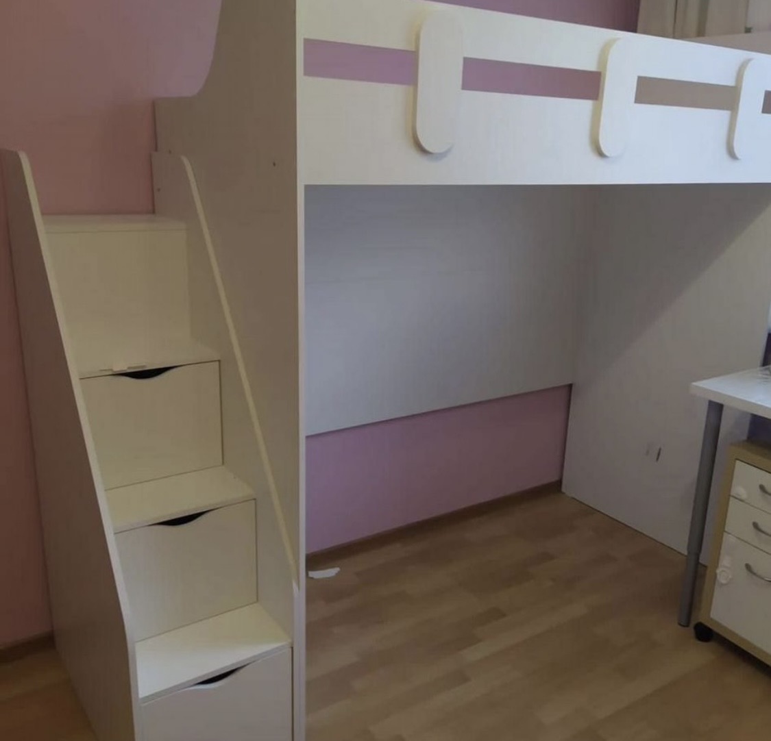<comment>Так как в комнате мало места, пришлось совместить два чердака и оставить одну лестницу. Очень удобно, что сразу получился полноценный набор для каждого ребенка. Кровать, стол, шкафчик. Очень функционально. Дети довольны! Спасибо </comment>