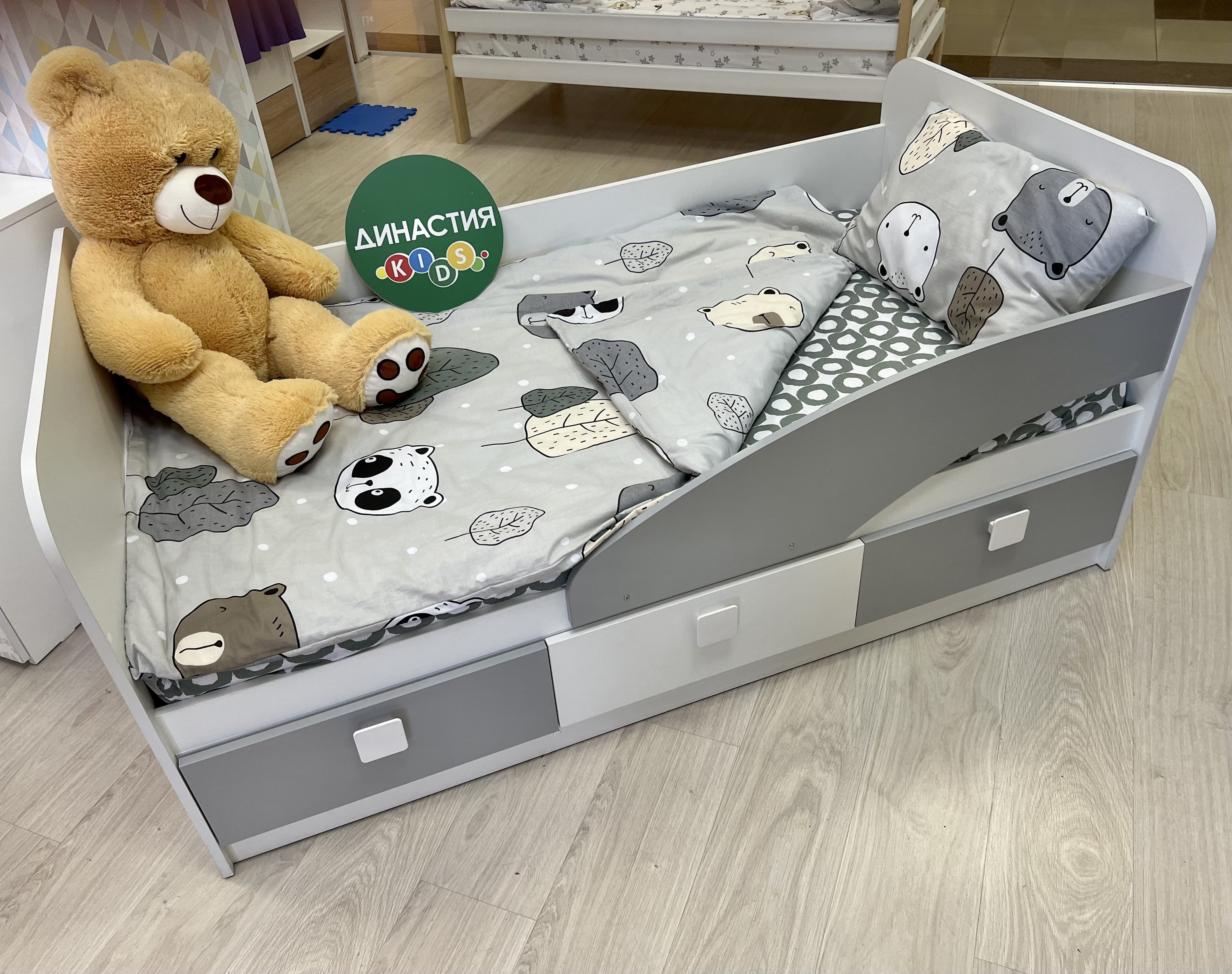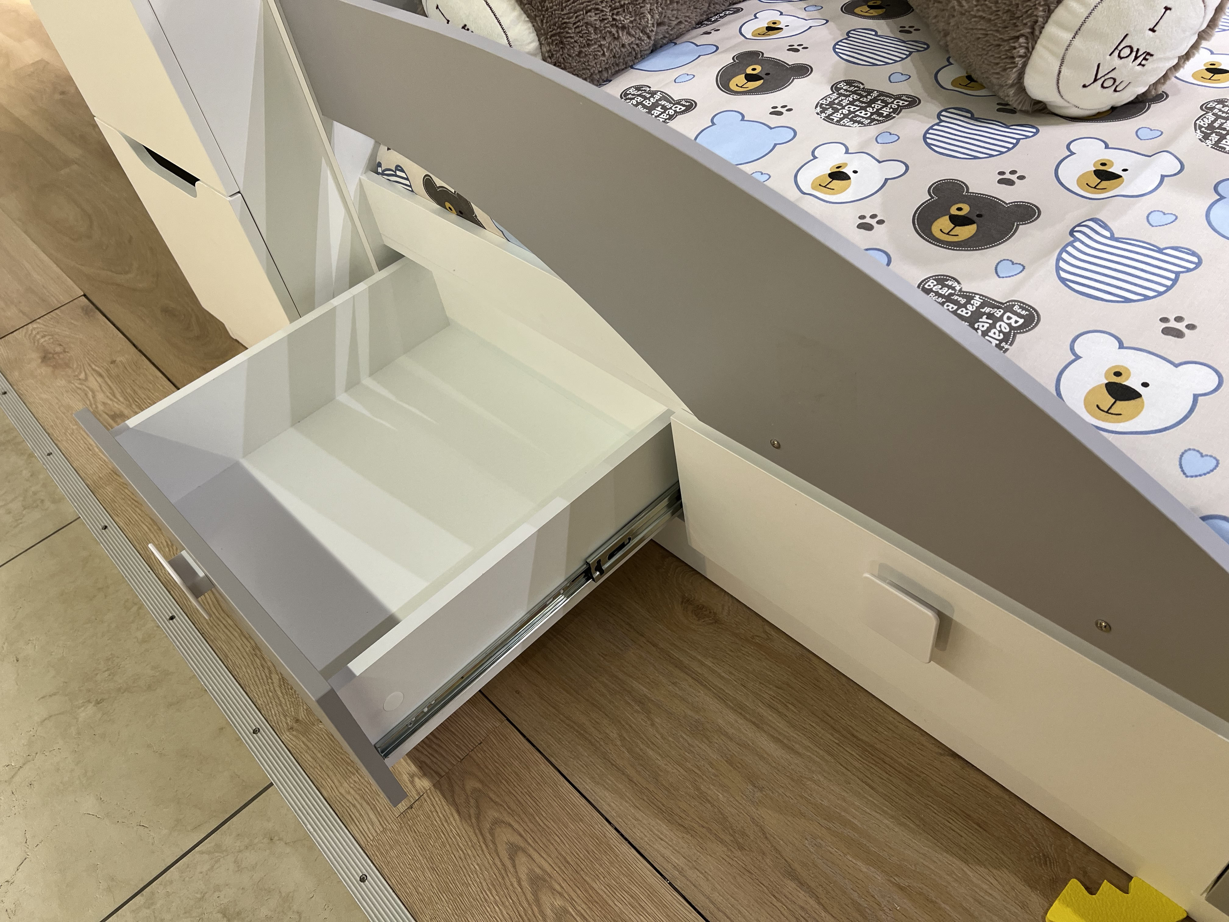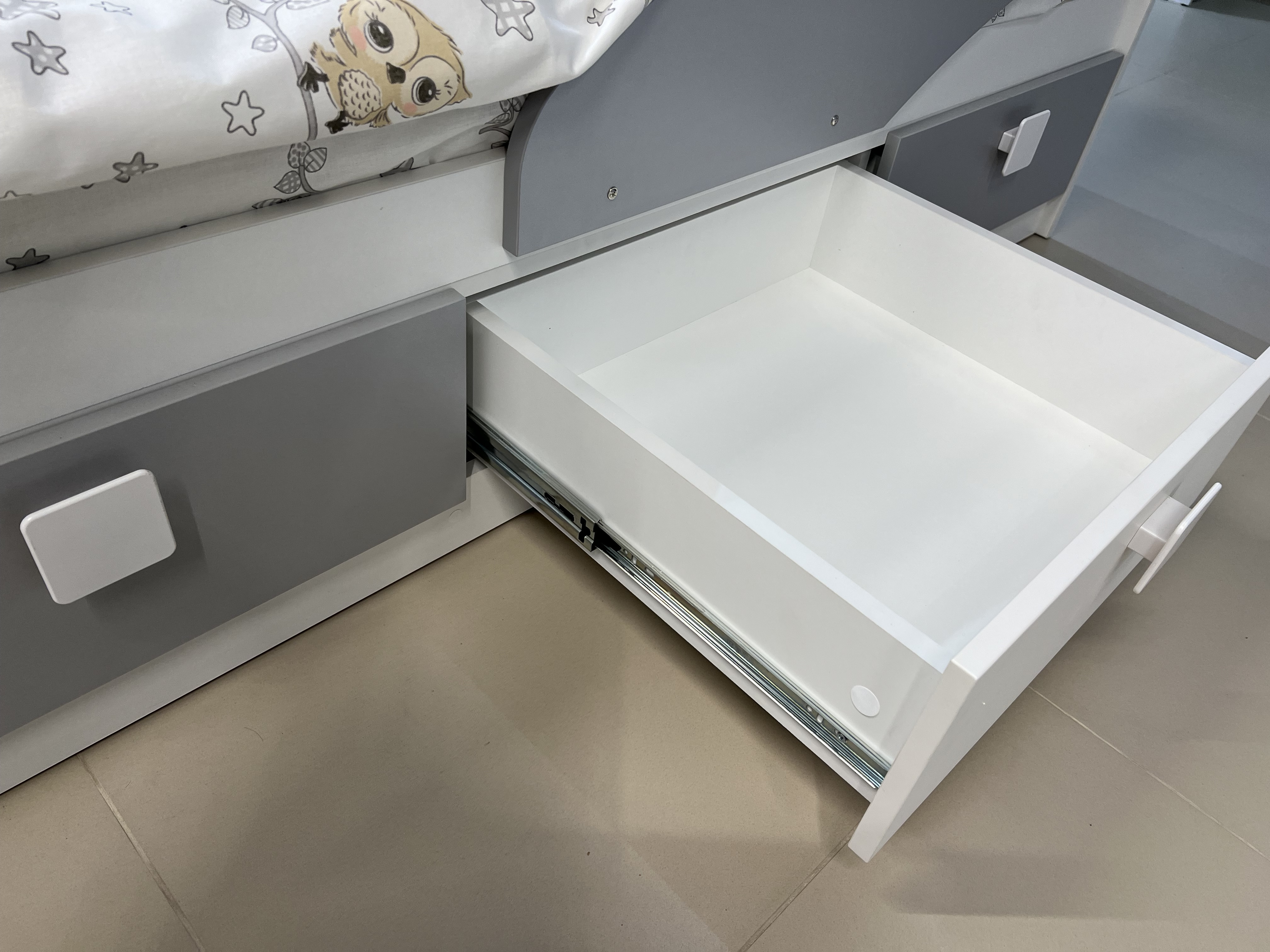 В кровать встроены три выдвижных ящика для белья и игрушек.
