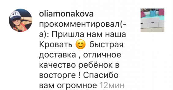 <comment>Спасибо, что пошли нам навстречу и сделали кроватку в сиреневом цвете. Доча счастлива! Благодарю от всей души всю вашу команду! </comment>