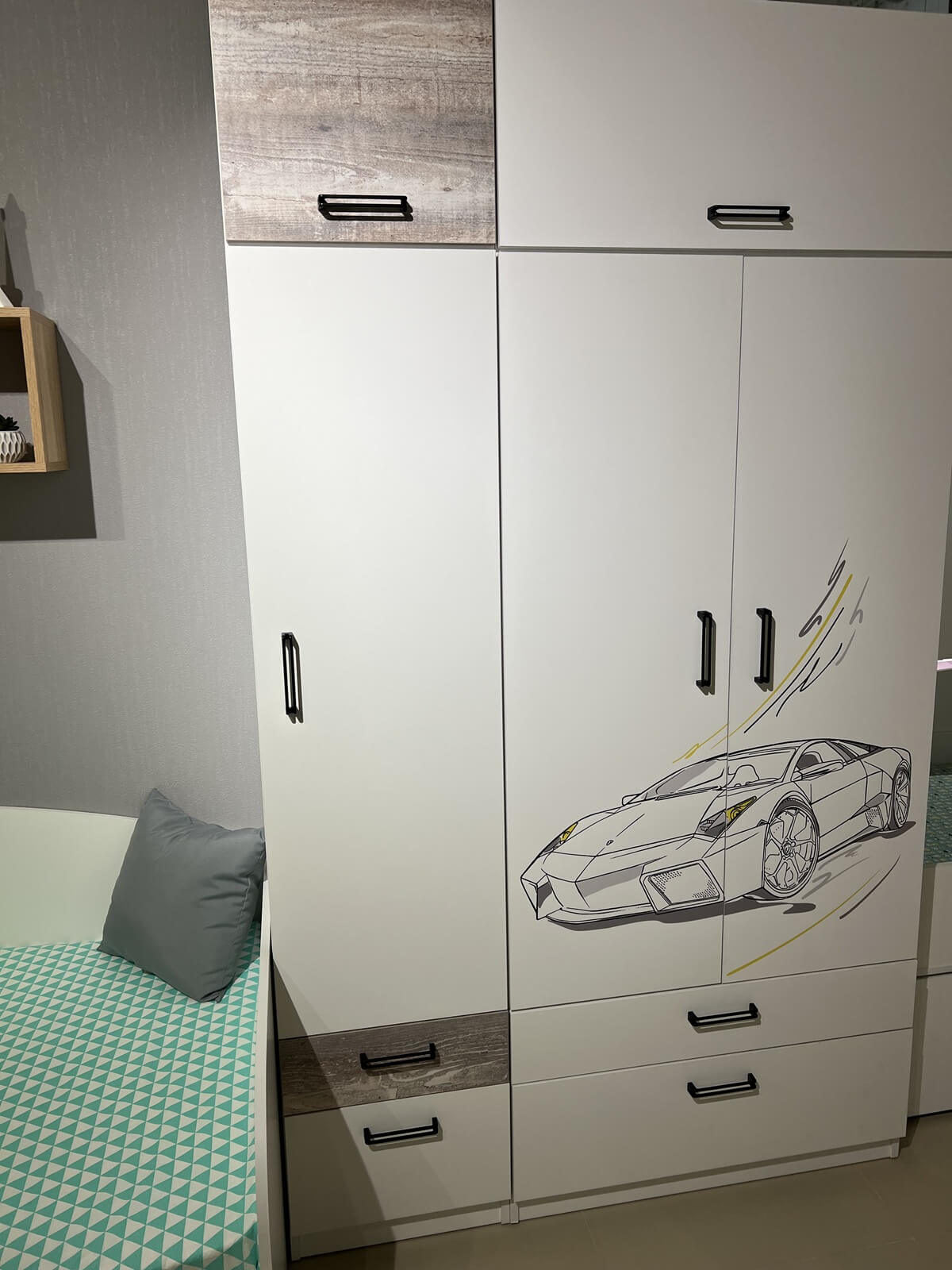 Мебель выполнена из сертифицированного, качественного, экологически чистого ЛДСП Е0,5 в сочетании цветов "бетон пайн" + белый.