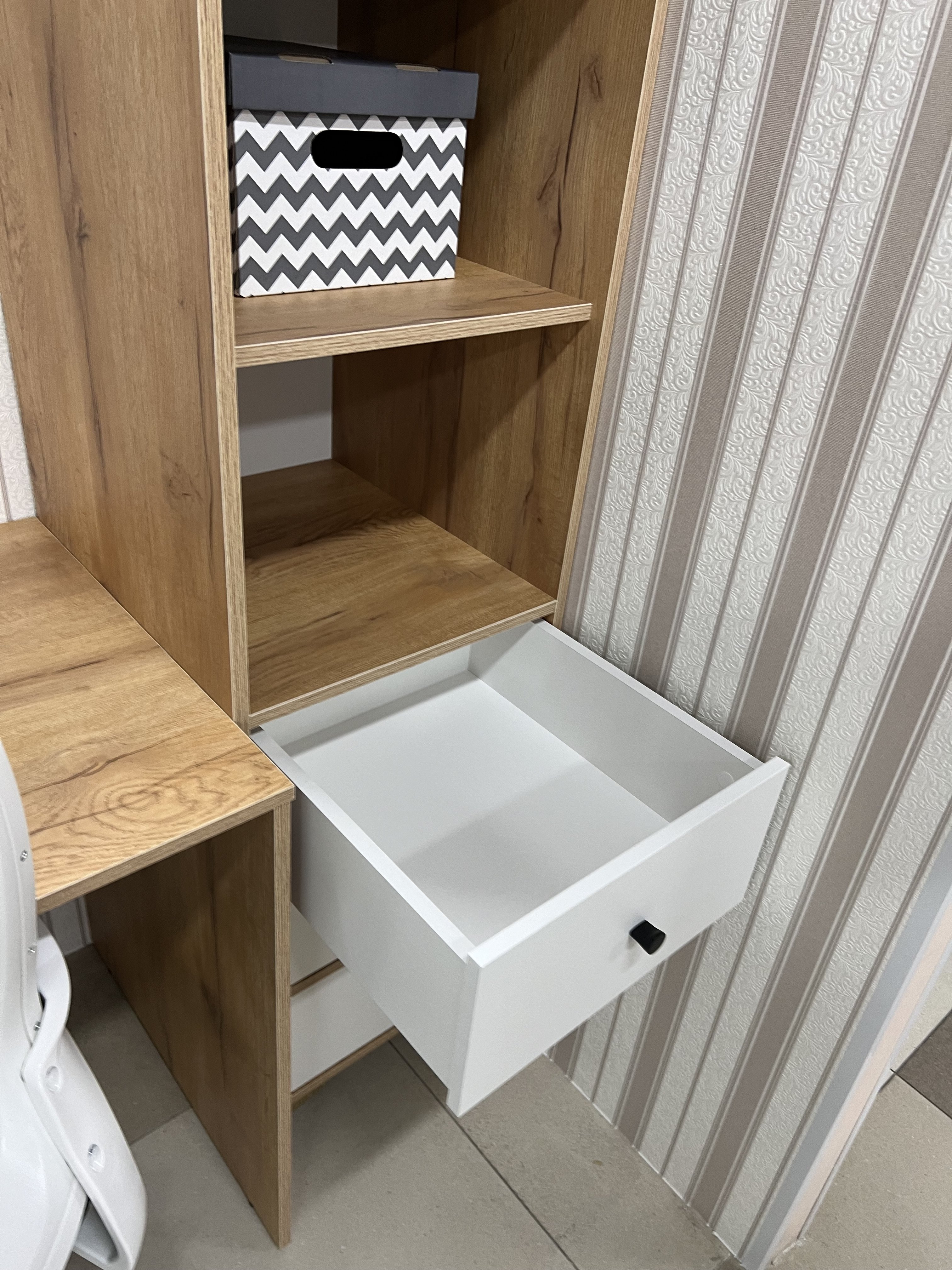 Доводчики, направляющие скрытого монтажа. Дно выдвижных ящиков прочное - выполнено из ЛДСП 16 мм (не ДВП!) |