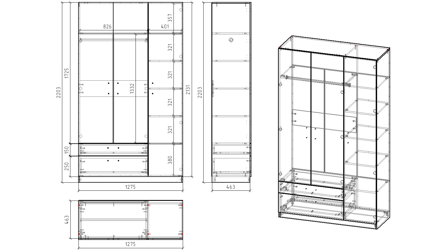 Габариты: ширина 1275, высота 2203, глубина 479 мм