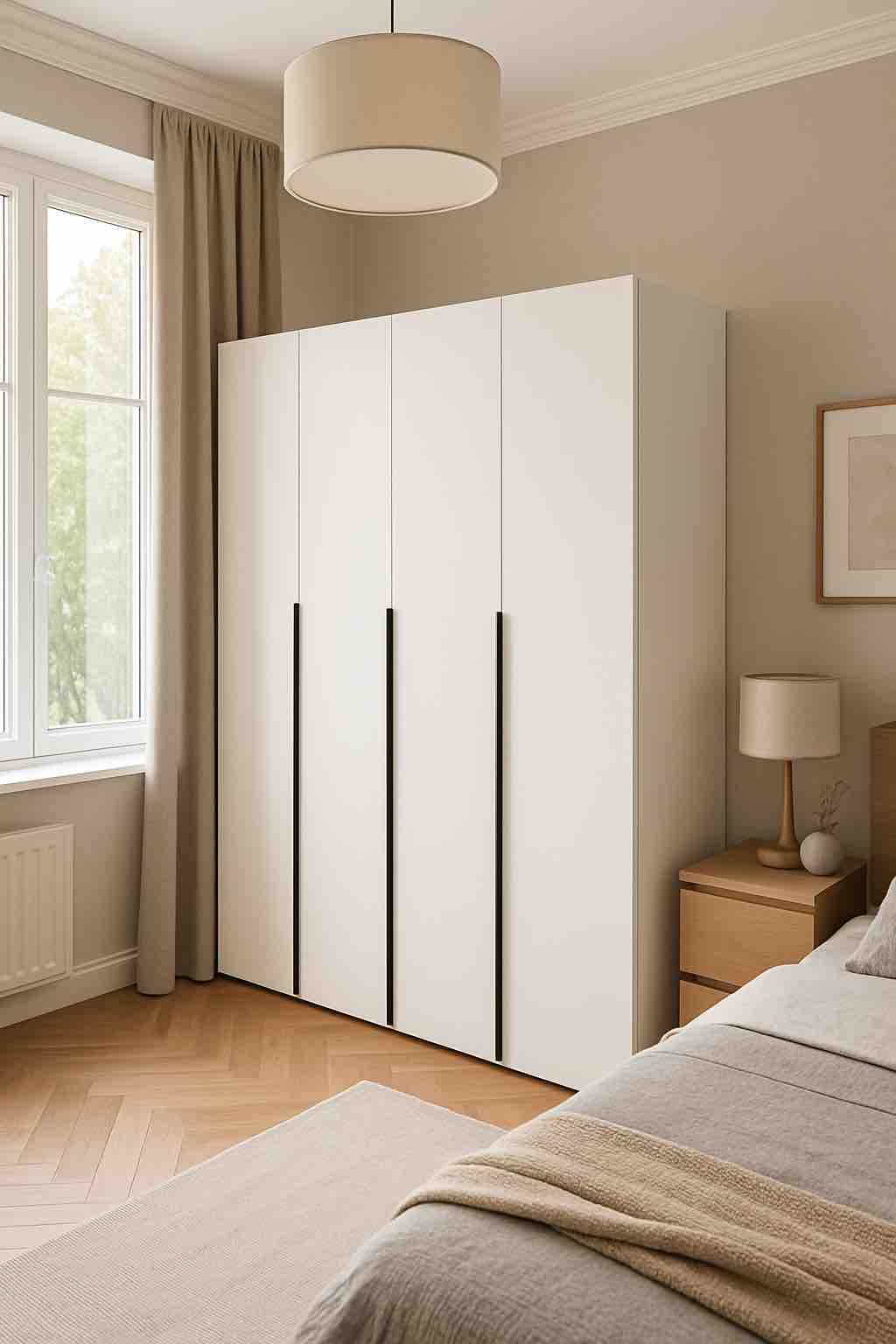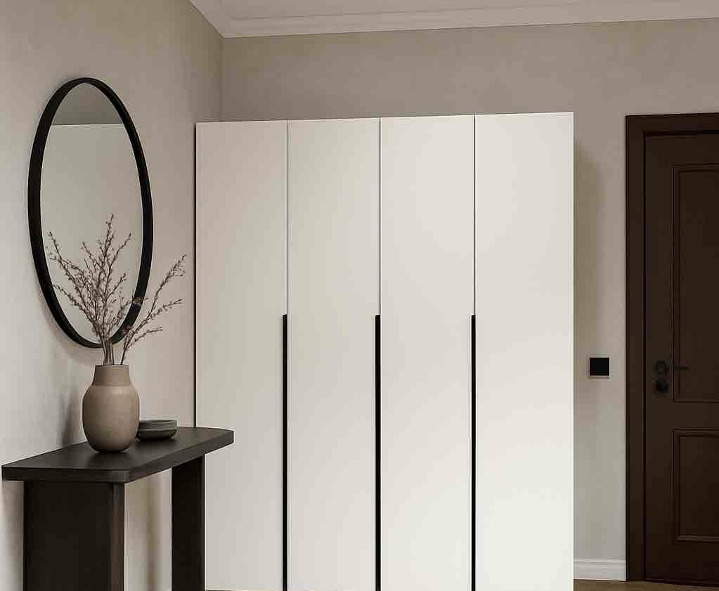 Шкаф имеет четыре распашные двери, которые оснащены доводчиками для плавного и бесшумного закрывания.