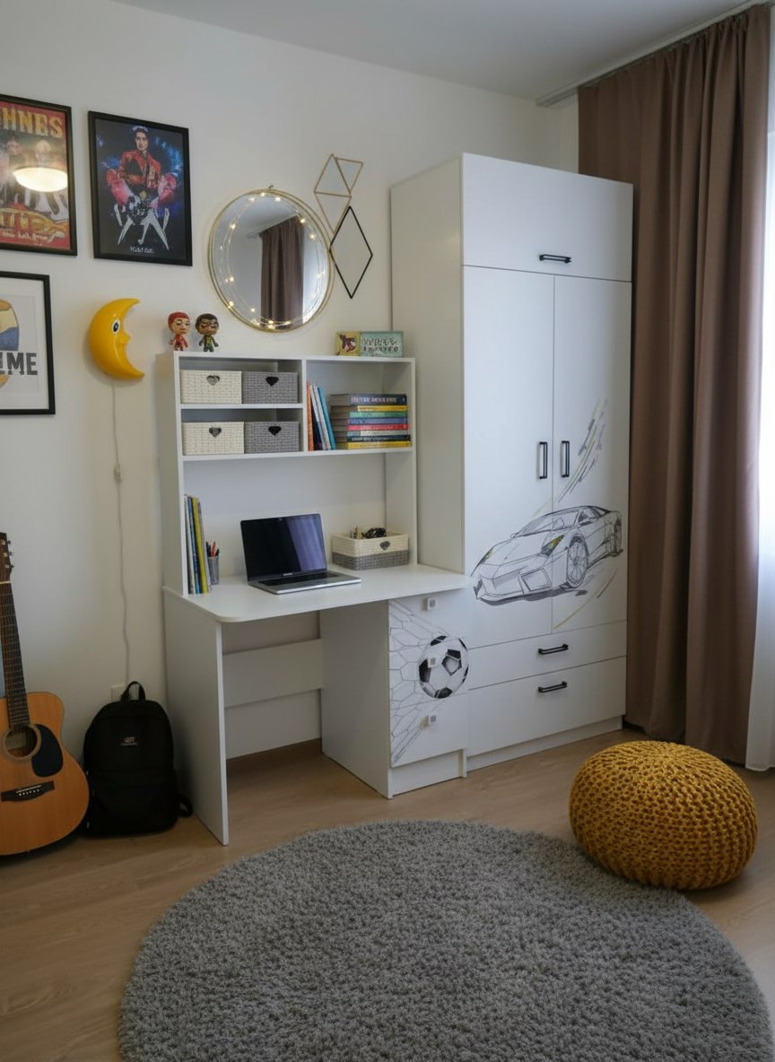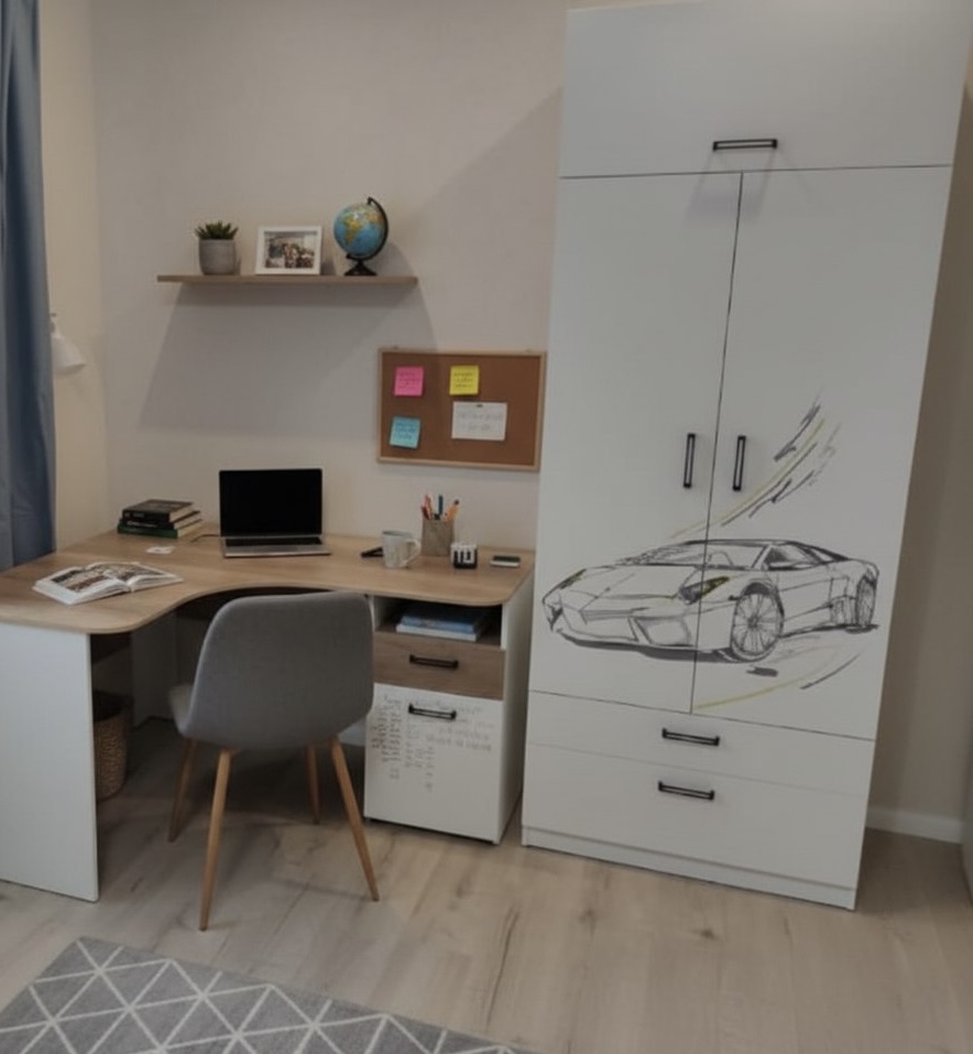 Мебель выполнена из сертифицированного, качественного, экологически чистого ЛДСП класса Е0,5 в белом цвете с дизайнерским принтом.