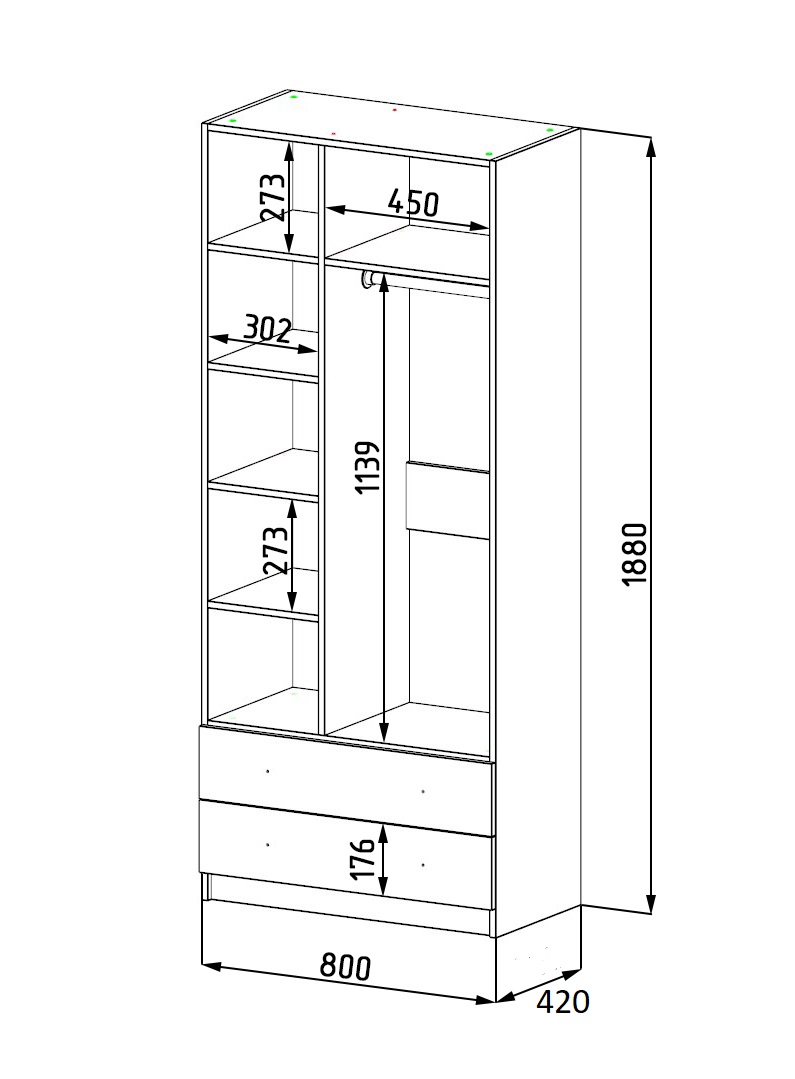 Габариты шкафа: высота 1880 х ширина 800 х глубина 420