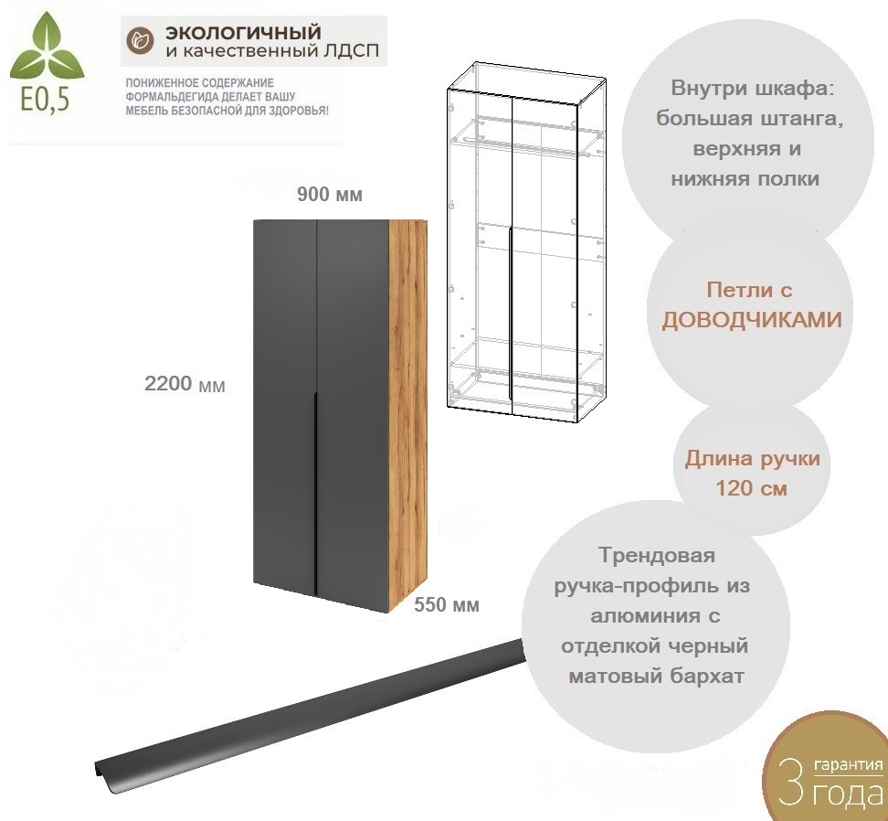 ЛДСП Е0,5. Толщина 16 мм. Доступна в цветах: корпус белый + фасады графит, корпус белый + фасады дуб золотистый, корпус дуб золотистый + фасады графит, полностью белый или полностью велюр